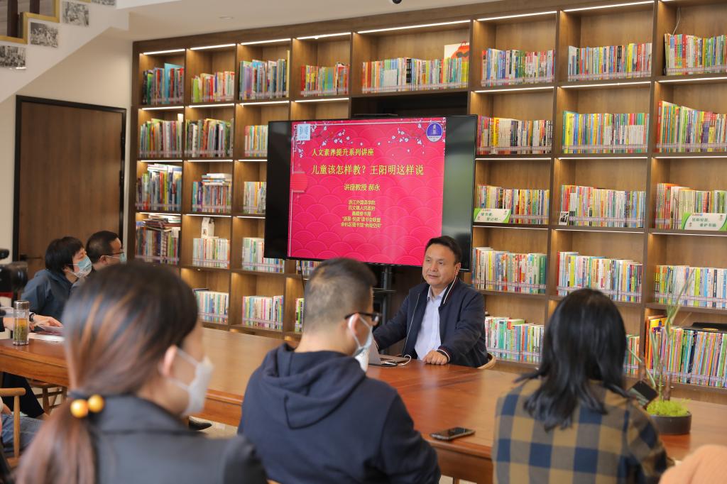 院长、宋韵文化传播研究所所长郝永教授来到余杭区百丈镇鑫藏修公益书屋,为百丈镇中心小学的老师和家长们开设了主题为“儿童该怎样教?王阳明这样说”的讲座,中文学院领导班子、百丈镇相关负责人等出席了讲座。