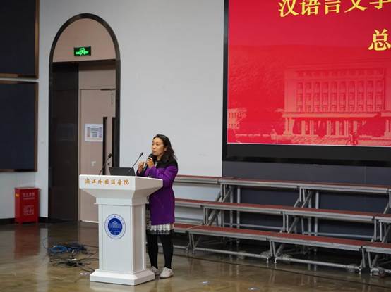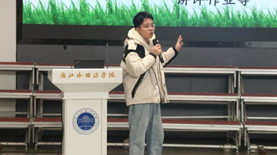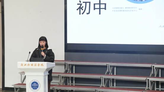 在实习经验介绍和分享环节,在华东师范大学附属杭州学校实习的优秀实习生代表徐平同学围绕《昆明的雨》一课进行了精彩的说课展示。在杭州市丰潭中学实习的楼嘉莹和黄元元两位同学和在杭州市十三中教育集团(总校)实习的楼文轩同学分别介绍了自己的实习经历、实习体验,讲解了实习对就业的帮助以及自身的成长和改变,并对21级同学提出了宝贵的建议。