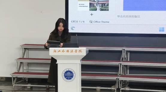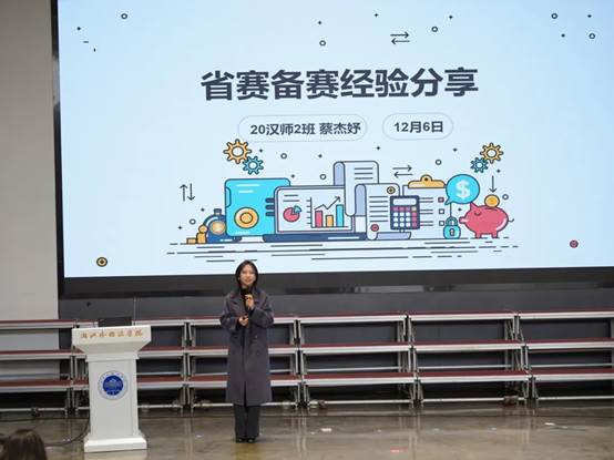 随后,刚刚获得浙江省高等院校第十七届师范生教学技能竞赛一等奖的陈子茜同学进行了示范讲课,给同学们生动地展示了《“飞天”凌空》一课,最后她鼓励同学们:只要去努力,就一定有收获。同样获得省赛一等奖的蔡杰妤同学则分享了备赛经验,从基础技能、资源获取、着装打扮、心态平和四个方面作了具体介绍。