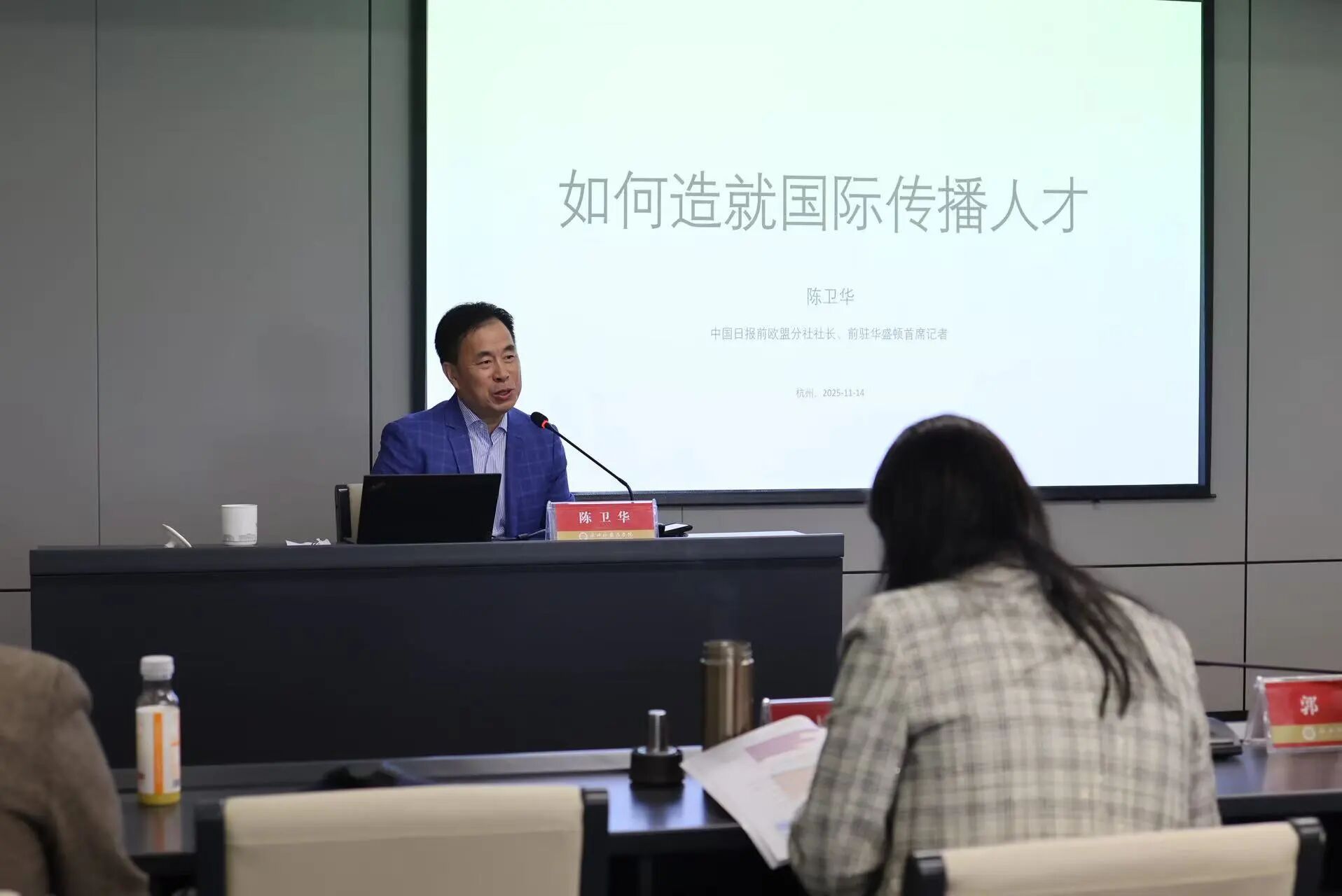 博达论坛第1078期顺利举行。本次论坛特邀中国日报前欧盟分社社长、前驻华盛顿首席记者陈卫华作题为“如何造就国际传播人才”的学术讲座。中文学院特聘教授郭可、学院院长马宏程、学院党委书记杨飞群、学术副院长孟奕辰以及国际传播学科全体教师与2025级网络与新媒体专业全体同学参加了讲座。