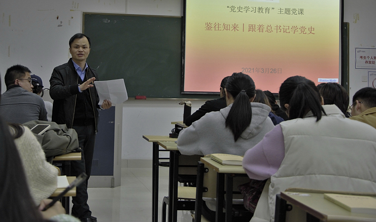 党总支副书记陆卫斌作讲话动员,并给大家带来了“跟着总书记学党史”的主题党课。