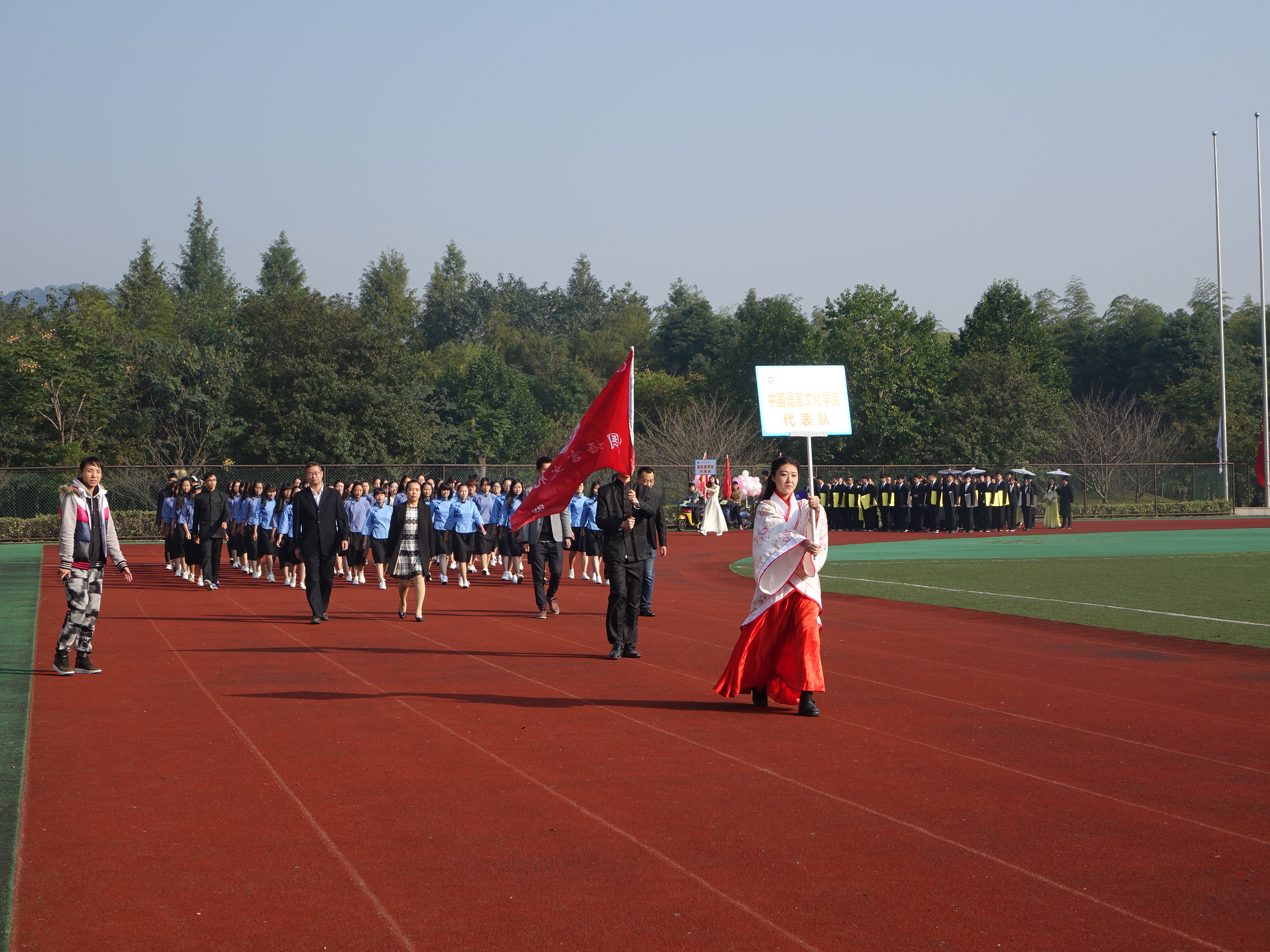 代表队步伐矫健地步入体育场,身着中山装的旗手身姿挺拔,身着汉服的引导员婉约古典,四位带队老师身着正装、英姿飒爽,运动员代表身穿民国服清新典雅。伴随着美妙音乐,身穿襦裙的学生翩翩起舞,为全校师生呈现了一支精妙舞蹈,美不胜收。
