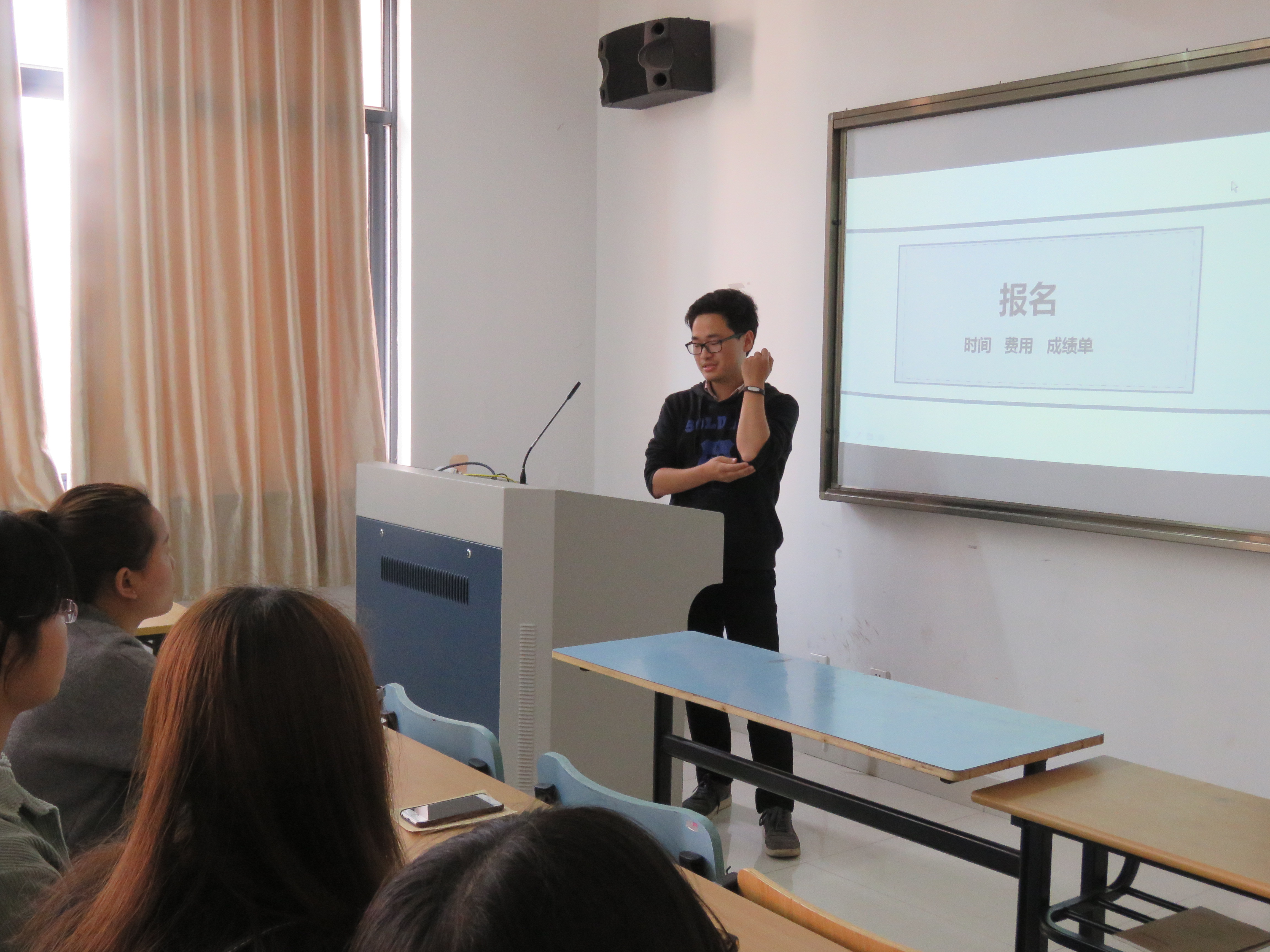 于教学楼206举办了大学英语四六级口语考试经验交流会。14级汉语国际教育的唐懿德同学和朱轶丽同学分别分享了自己的考试经验。