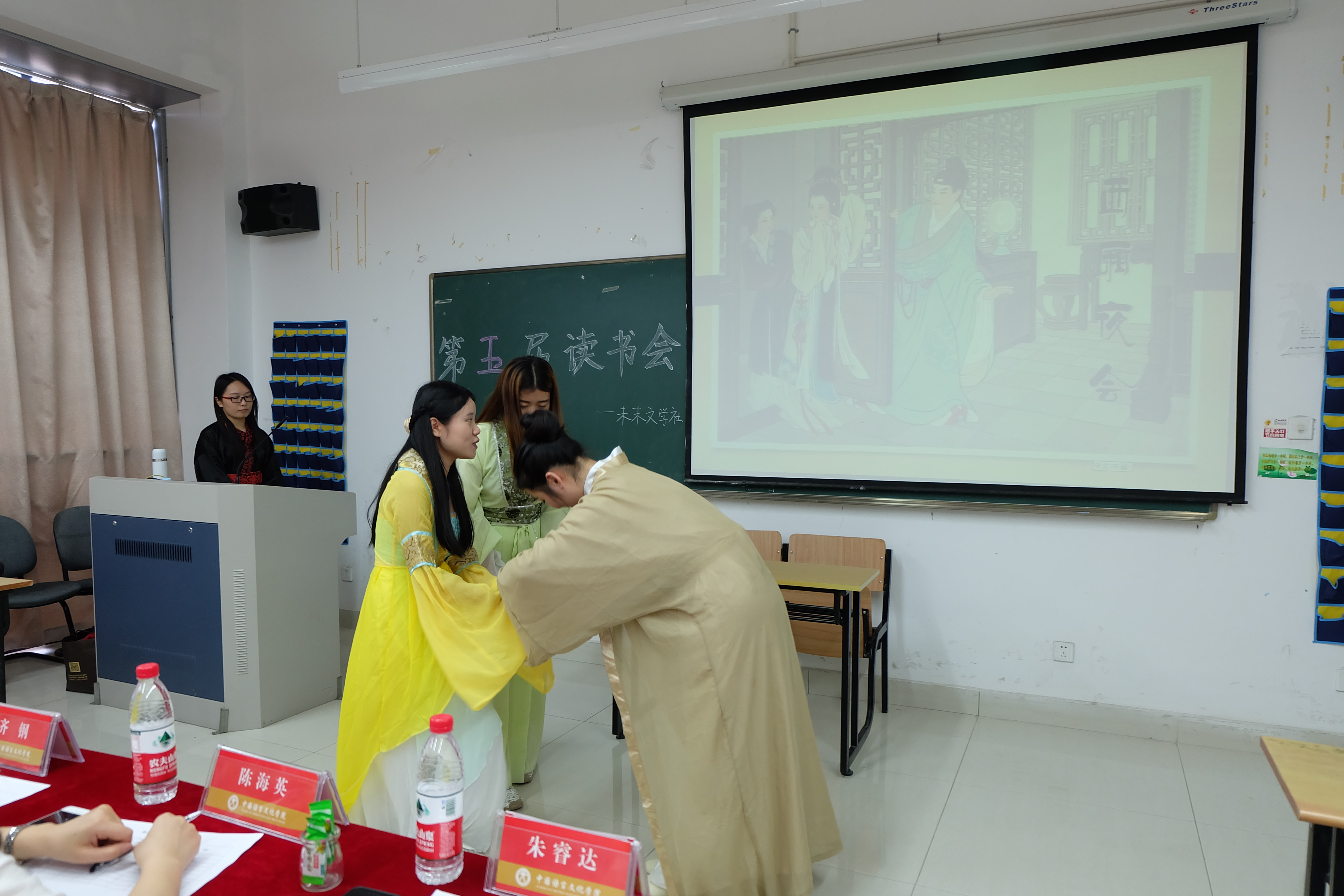 各位选手在分享完剧本后,经评委老师认真分析商讨,宣布本次读书会获奖名单:13汉师1班王丽佳等人的《西厢记》获得一等奖;15中文1班王泽鑫的《被缚的普罗米修斯》和14汉师1班的《鸣凤之死》获得二等奖;15中文1班李佳欣的《弗兰肯斯坦的罪与罚》、陈婷的《活着》、15中文4班杨珂等人的《道林格雷的画像》和15旅管2班周可心等人的《羊脂球》获得三等奖。至此,未末文学社第五届读书会圆满结束。