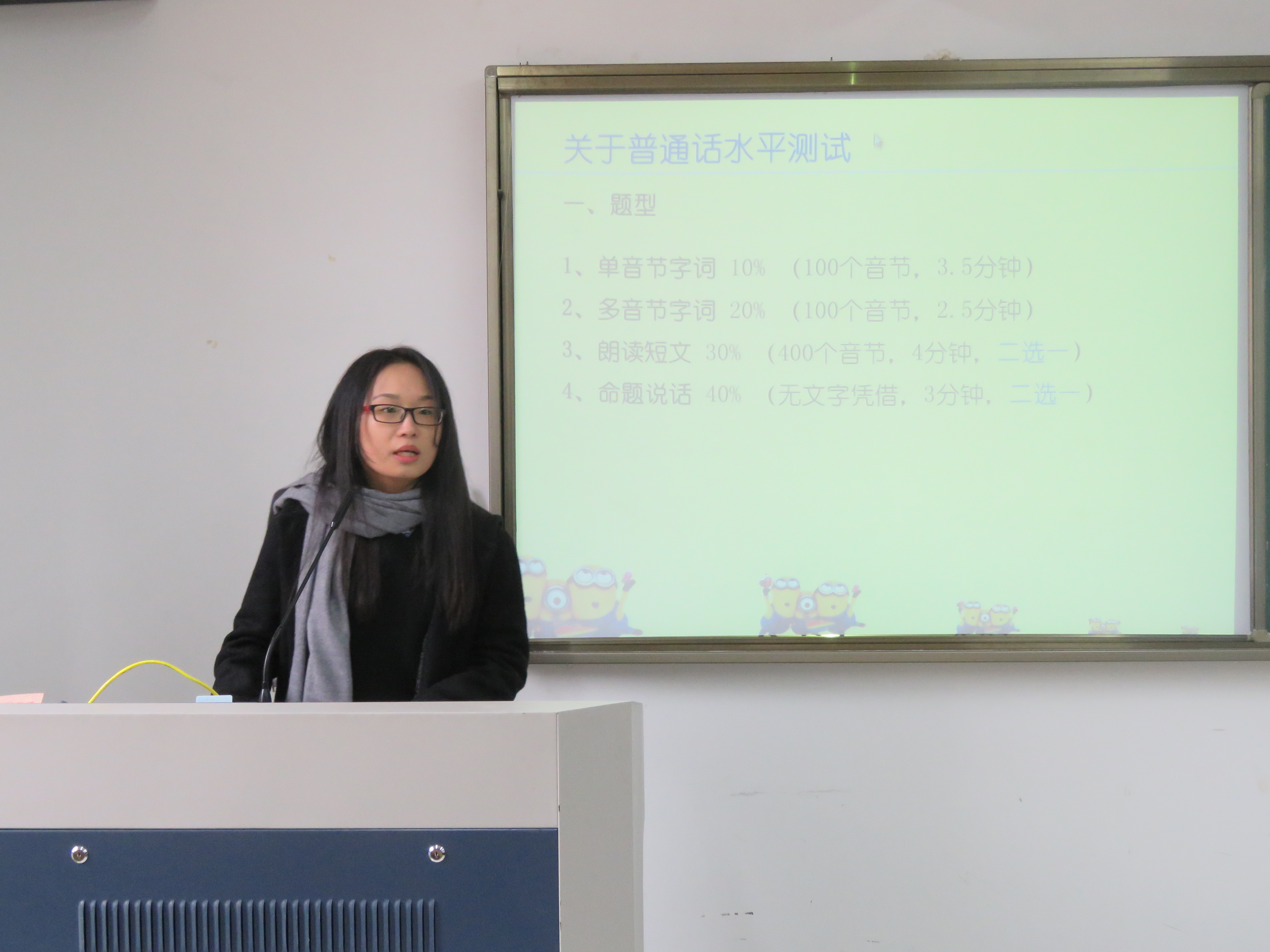 本次交流会邀请13汉师1班董海琪和13汉师2班王春为同学们介绍普通话学习的心得体会,分享备考和考试经验。两位同学结合自身经历,深入浅出地为同学们介绍了普通话考试流程、考试题型以及考试的注意点,并图文并茂地大方分享普通话学习的相关技巧,如:普通话的声调、归音方法;细节如“啊”的音变等,讲解细致入微,引人入胜。此外,他们还为同学们如何学好普通话提出诸多建议,如多听新闻报导、以听为前提,说为重点等,这些经验都令参加交流会的同学受益匪浅。