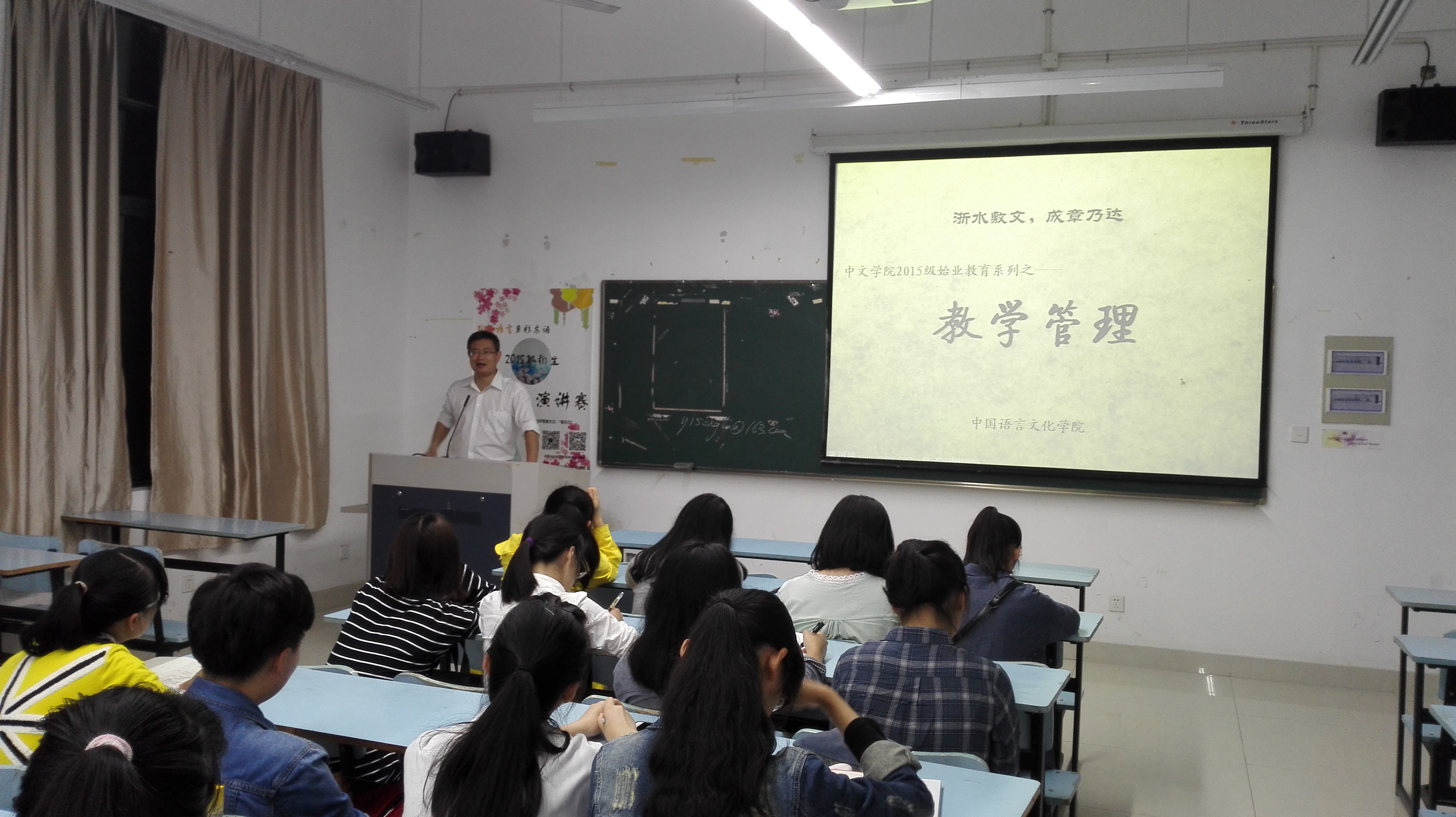在小和山校区给中文2015级新生进行了始业教育讲座。中文学院副院长李倩、汉语言文学系主任马宏程、国际文化传播系副主任曾来海、国际汉语教育系副主任朱睿达出席并进行了专业而精彩的介绍。