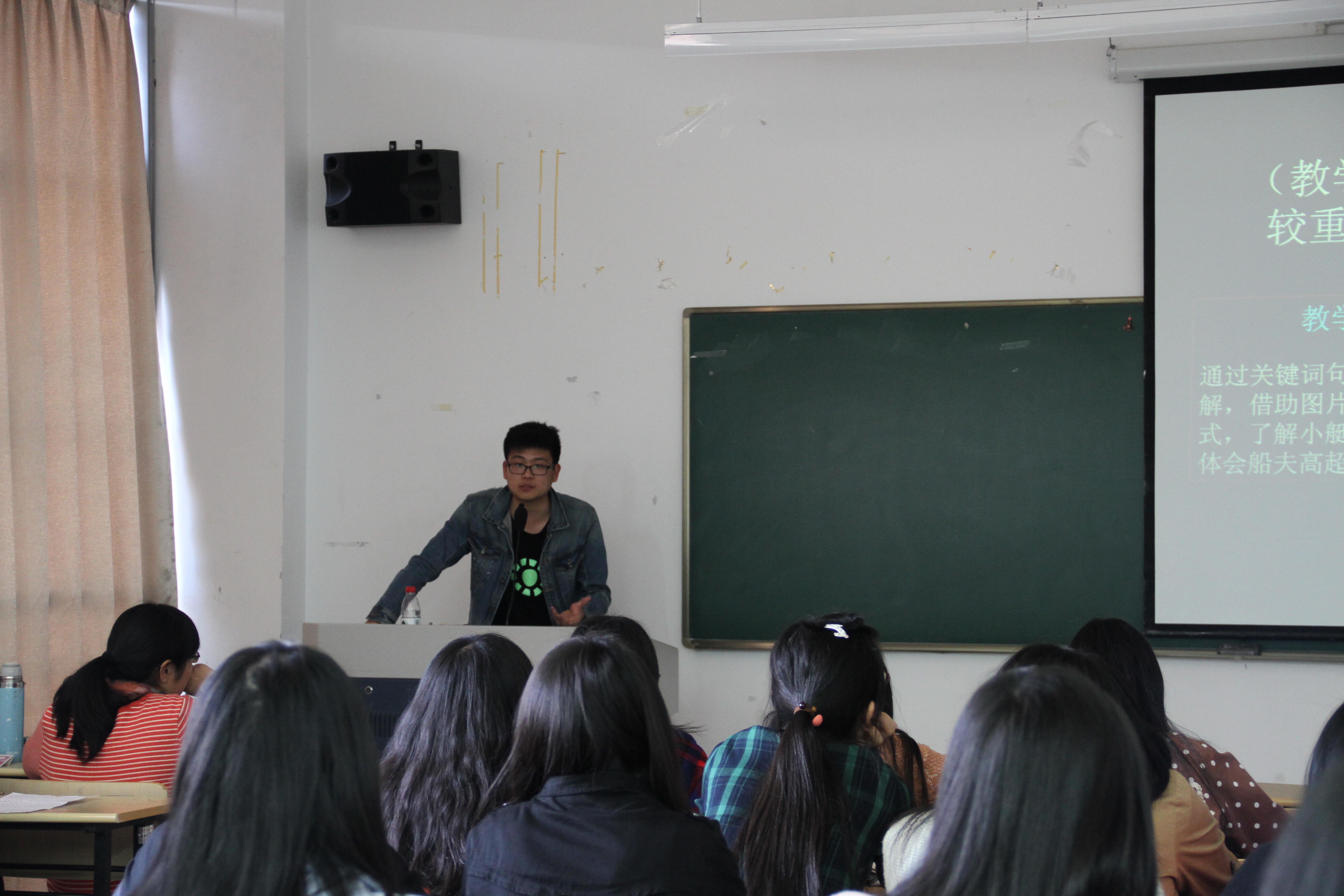 汪华鹏同学从说课所含的几个方面做了生动详细的介绍。首先,他从“说课”一词入手,明确其定义,接着又围绕“说”展开论述。他指出“说”包括“说教材”、“说学情”、“说目标”、“说教法与学法”等部分,并结合自身经验进行了阐释。此外,他还补充分析当今教育形式、教师招考相关信息以及实际教学中可能遇到的各种状况。汪华鹏同学幽默风趣的语言表达,深入浅出的术语解释,引得现场掌声不断,气氛颇为活跃。同时,他不拘泥于概念上的解说,加入个人心得体会,不仅给在场同学们留下深刻印象,也为大家提供了宝贵的说课经验。