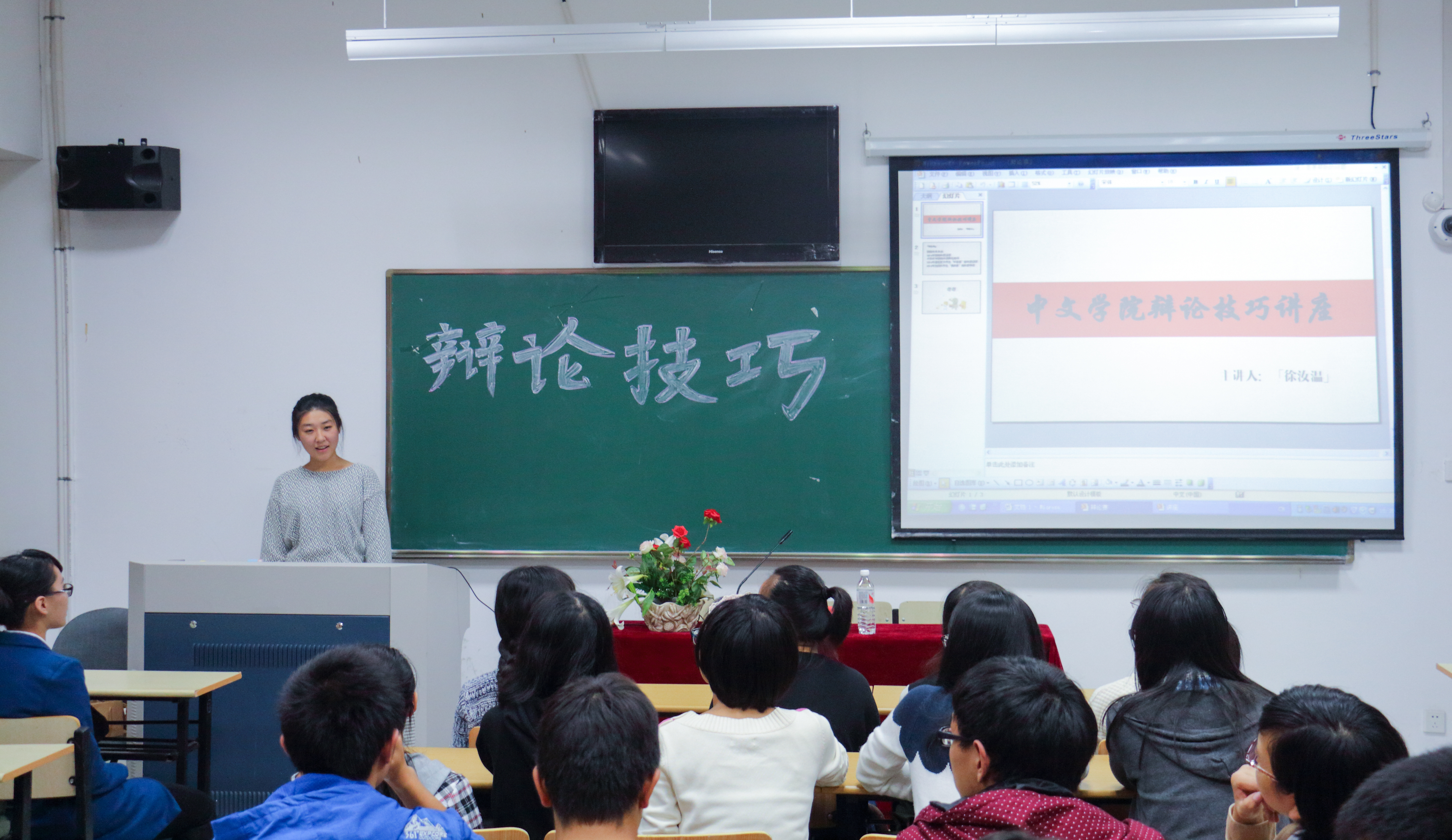辩论队在本次国辩赛中打败厦门大学的情景,在分析辩论规则的同时也说明了辩论者陈述论点时层次分明、条理清晰的重要性。在讲座的最后,她总结常见的立论方法,就如何在日常生活中的实现自我提升分享了几点宝贵经验。