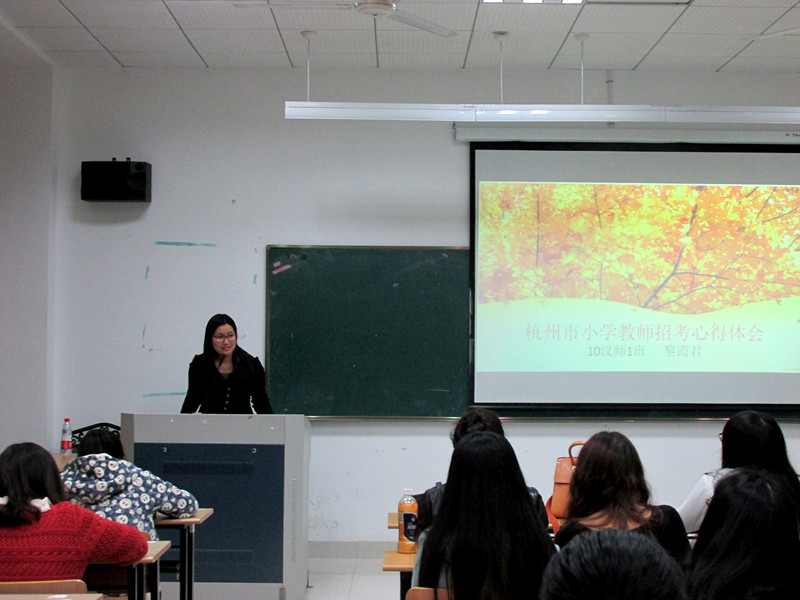 10级同学的毕业去向。随后,关于师范生普遍关注的教师招考问题,黎霞君以自身经历为例,提醒同学们要充分准备笔试,自信应对面试,主动寻找机会。此外,她鼓励师范生积极参加与师范专业相关的比赛,如教师技能大赛,并强调了赢得这类比赛在教师招聘中的优越性。紧接着,金霞就出国留学问题为大家进行讲解,她表示,选择一个信得过的中介对大多数同学而言是至关重要的。而吴小萱则讲述了她的艰辛考研道路,她指出,大学生要制定符合自身情况的作息表,早睡早起,重视效率。