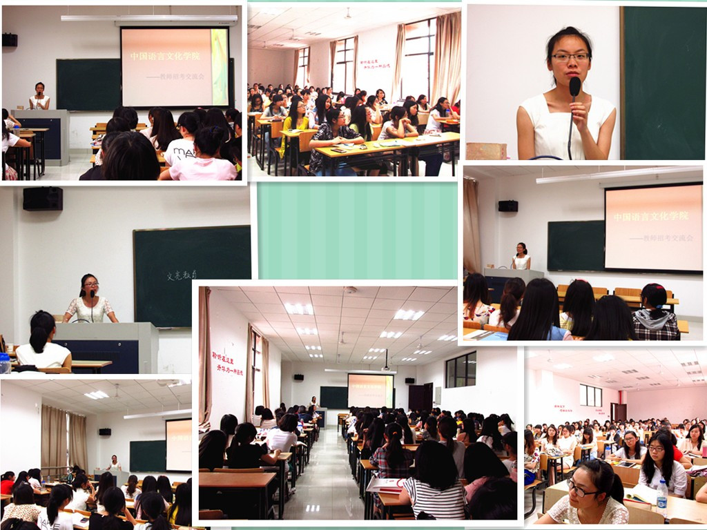 在2013年的教师招考中分别被杭州学军小学与台州玉环教育局录用的来自09级汉语言文学专业的叶林峰与蔡文辉参加了交流会。叶林峰从生活、学习、爱情三方面和大家分享了她的心路历程。在她看来,生活中,读万卷书不如行万里路,行万里路不如结交百位朋友;面对学习,要对自己狠一点,未来才能美一点;对于爱情,它并不是大学的必修课,而是一门选修课,因此我们要端正生活的态度,努力地从各方面提升自己。