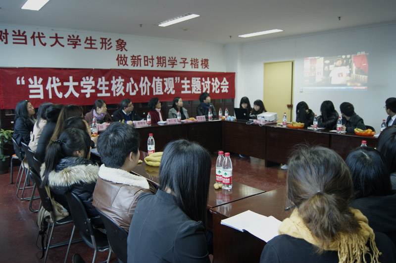 组织了“当代大学生核心价值观”主题讨论会活动。在观看了“好人的光辉,雷锋”、“雷锋传人郭明义”等视频后,师生们聚焦社会、结合校园,围绕热点,立足自身,着重就如何树立正确和科学的偶像观、诚信观、财富观等方面内容进行了深入的讨论——