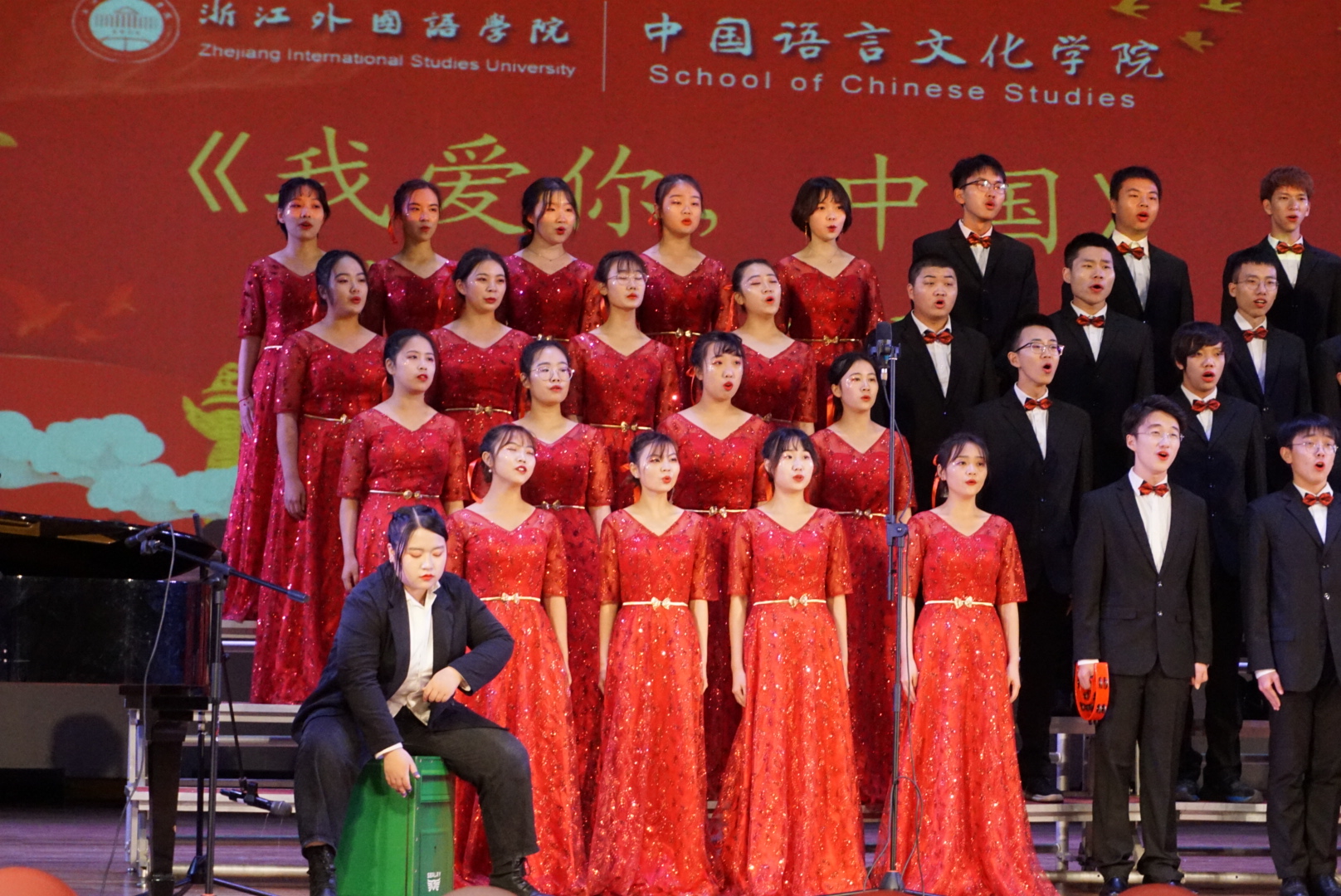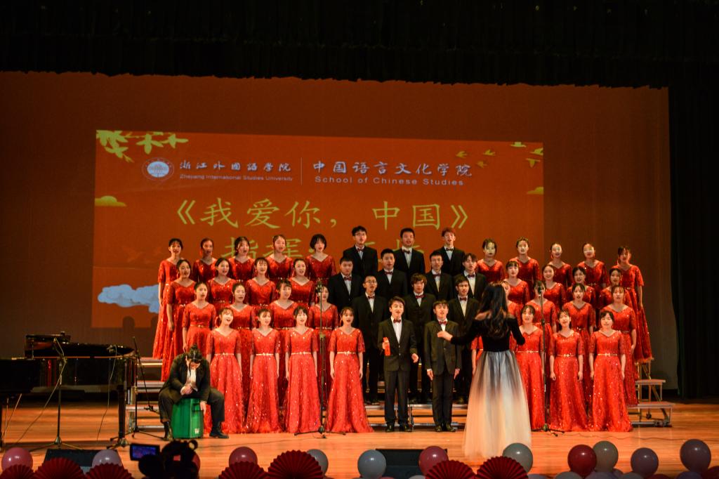 经过半个多月不懈的排练,作为压轴出场的中文学院表现出色,展现了绝佳的精神风貌。中文学子用饱满的爱国热情演唱了《我爱你中国》这首歌,一声声“我爱你中国,亲爱的母亲”向期颐之年的祖国母亲诉着衷肠,表达了浙外青年浓烈的爱国情怀。高潮部分一下下整齐划一的击掌声将全场的气氛引向燃点,赢得了观众的阵阵欢呼。