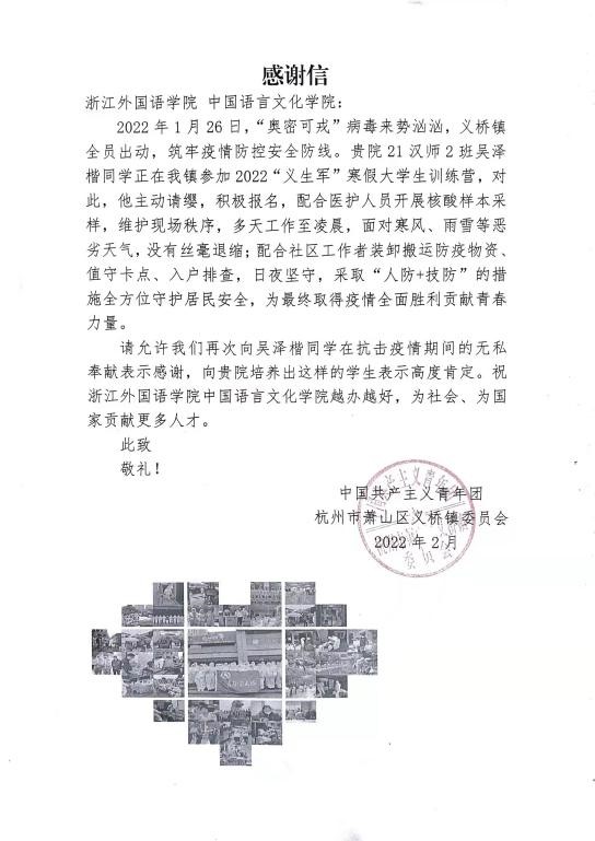 收到一封来自中国共产主义青年团杭州市萧山区义桥镇团委的感谢信。信中对2021级汉语言文学(师范)专业的吴泽楷同学的积极参与、敢于付出的青春风采做出了高度肯定,也同时为其不畏风雪、无私奉献的志愿服务工作表达了诚挚感谢。