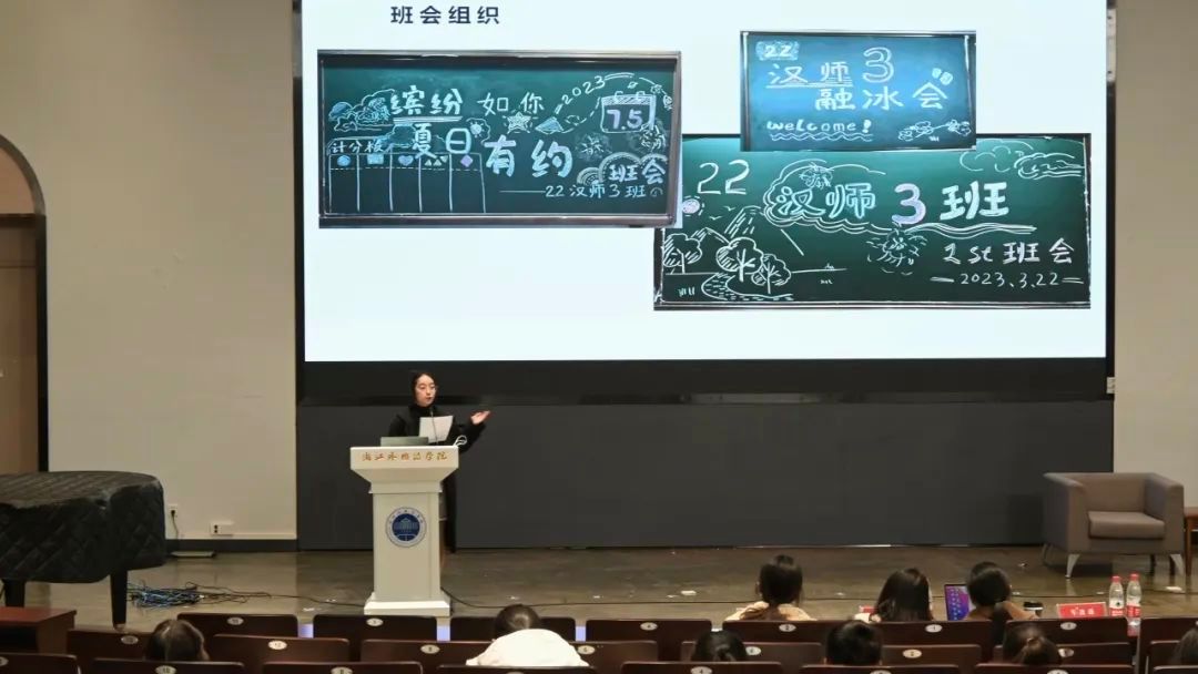 22汉师3班的汇报人林易霏从出色的学习成绩、丰富的实践活动、傲人的获奖情况入手,向我们展示班级学风建设情况。值得一提的是22汉师3班独特的班级建设:丰富多彩的班会,分享展示游戏,以及班级开展的“寻与瀚室·贰贰叁记”主题作品集,目前共收录25个文字作品。同时,班级还每星期由同学轮流推荐书目,构成“寻与书库”。