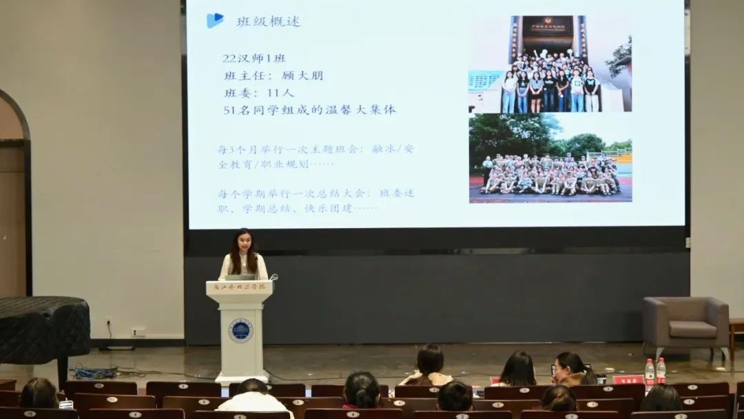 谢烨欣为我们带来22汉师1班的班级学风汇报。她将重点聚焦于班级同学优异的各项成绩。A、B类学科竞赛参与度与获奖情况显赫,专业素养类、文学类、艺术类、体育类等活动成绩显赫。22汉师1班的同学们特长丰富,积极参加各项活动和比赛,拓展视野,在多个领域闪闪发光。除此之外,22汉师1班的同学们投身于亚运亚残服务,收获二十多封感谢信,并被央视新闻、CCTN、新华社等多家媒体采访报道。