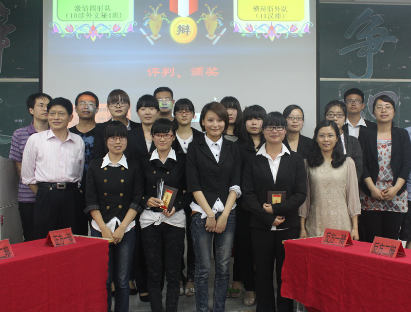 本次辩论赛历时近两个月,共有10支队伍参赛,大家围绕“古典书籍通俗化对文化传承的利与弊”、“文才与口才孰更重要”、“当今社会该不该支持裸婚”、“微博实名制利大于弊还是弊大于利”等辩题共上演了23场精彩对决。辩论赛的冠、亚、季军分别为2010级涉外文秘班、2010级对外汉语班、2011级汉师班摘得,其中2011级汉师班汪华鹏和2010级汉语言文学2班张洁莹获得“最佳辩手”称号。