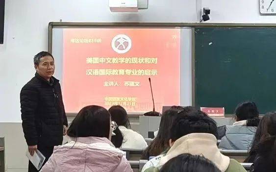 12月21日13:30,来自美国伊利诺伊大学香槟分校东亚语言文化系汉语语言学方向长聘助理教授苏蕴文老师于望D207作“美国中文教学的现状和对汉语国际教育专业的启示”讲座。中文学院院长马宏程到会并主持,学院大一、大二汉语国际教育专业学生参加。