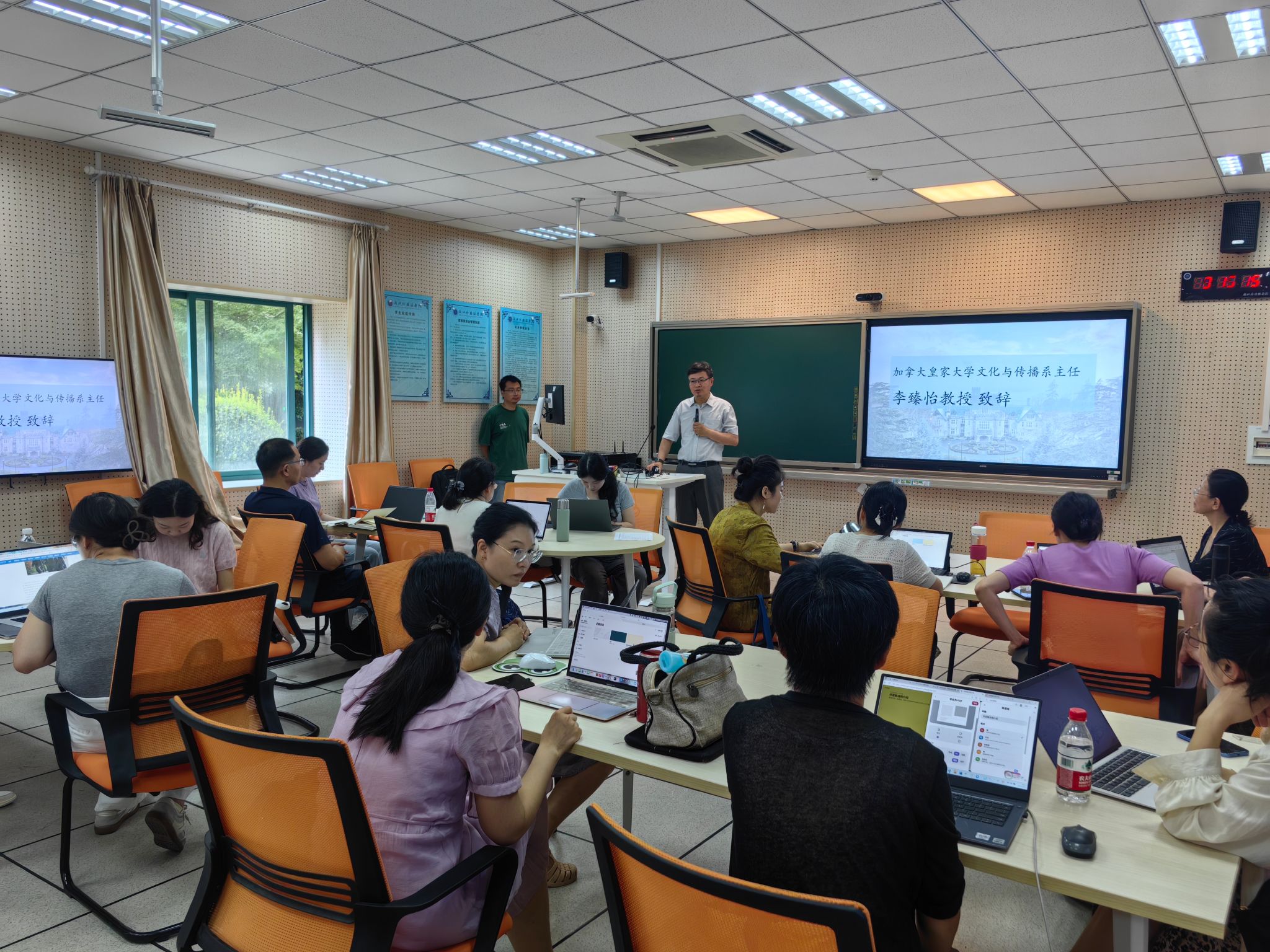 课程包括为期5天的线下集中授课和6次线上工作坊。线下集中授课由加拿大皇家大学跨文化与国际传播硕士项目主任李臻怡教授主讲。课程紧扣数字变革前沿,系统解析了跨文化传播等专业理论,直击当下教育痛点,并分析全球传播技术对跨文化互动的影响。授课中,李臻怡聚焦金砖国家传播动态,引导参训教师将跨文化传播原则融入教学情境,推动跨学科协作模式构建,助力教师打造互动性课堂。参训教师纷纷表示,课程讲解了前沿理论,更提供了可应用于课堂教学实践的“工具箱”。