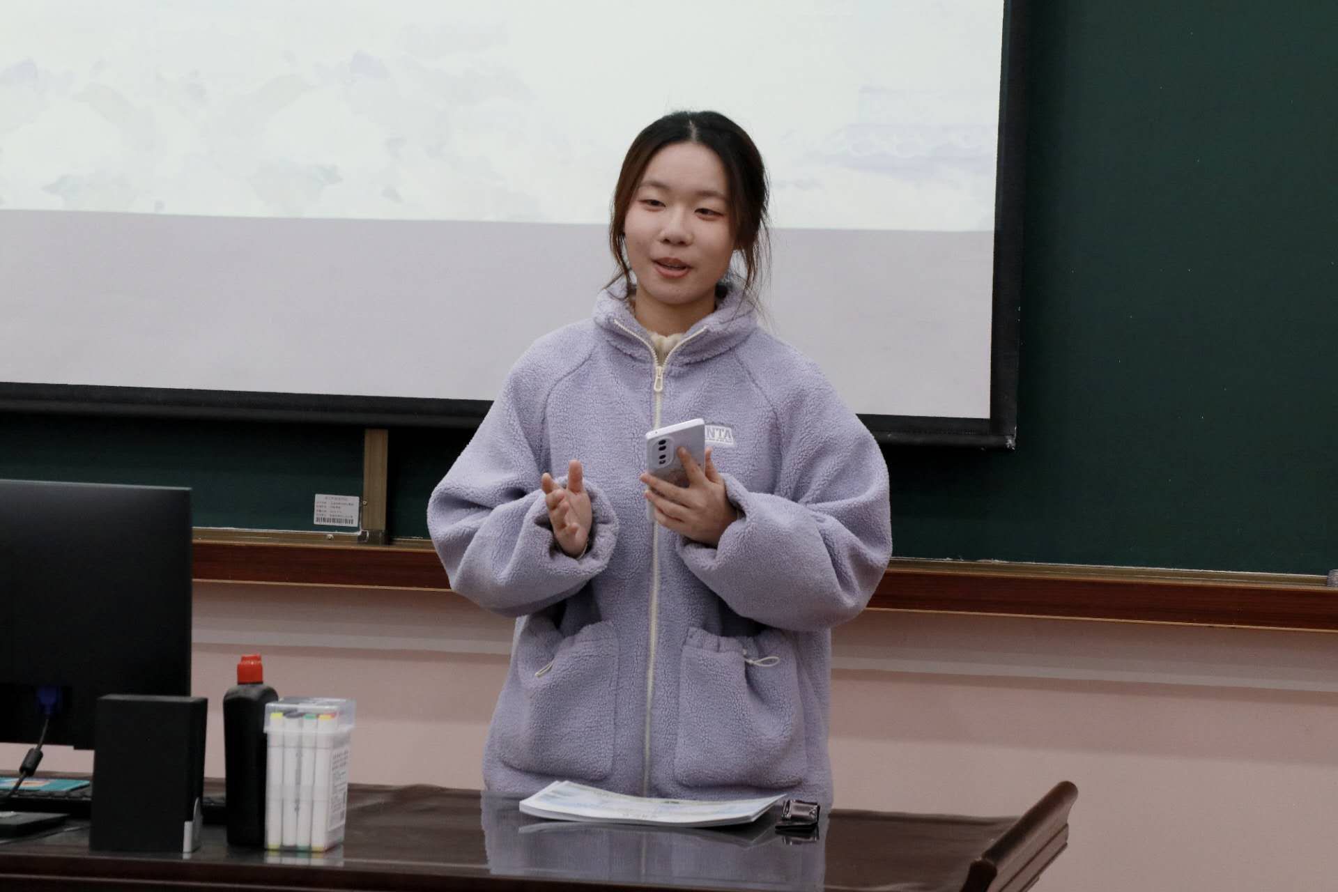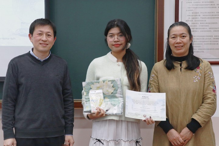 中文学院国际化学生助理徐暄迪也上台发言,徐同学全程参与了冬令营的筹办和组织,负责汉教系助教安排等大量工作。在前期准备工作中,助教们与老师们精心筹备,力求为同学们打造一个丰富多彩、充实有趣的冬令营。从最初的破冰活动,到汉语课和文化课上同学们的认真听讲、积极互动,再到文化探讨活动中大家对博物馆参观的热情满满,每一个瞬间都见证了泰国同学们的成长与进步。徐暄迪感慨地说,冬令营的成功举办离不开每一个人的努力,而同学们的收获与成长就是对所有付出最好的回报。