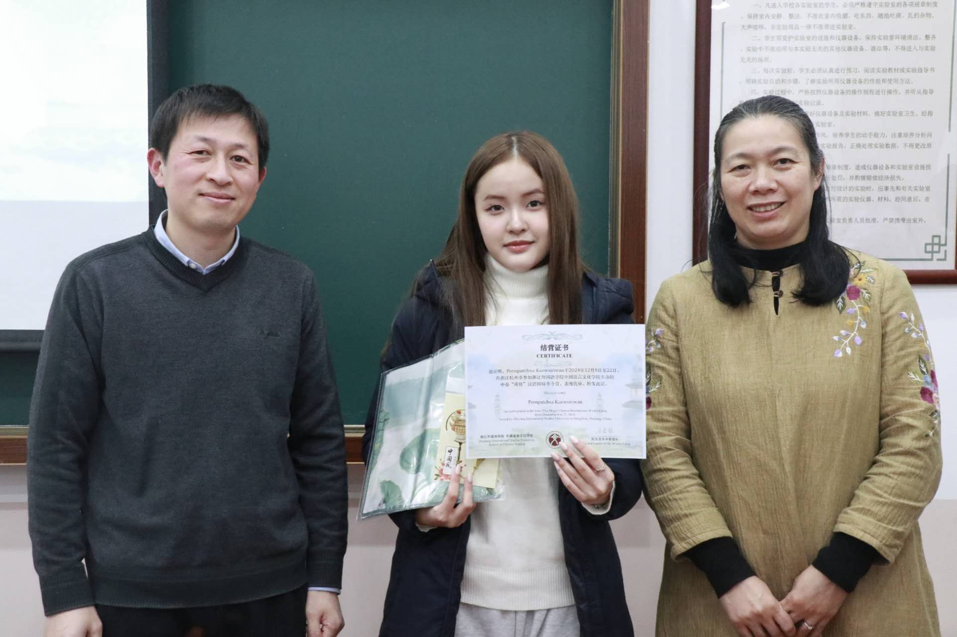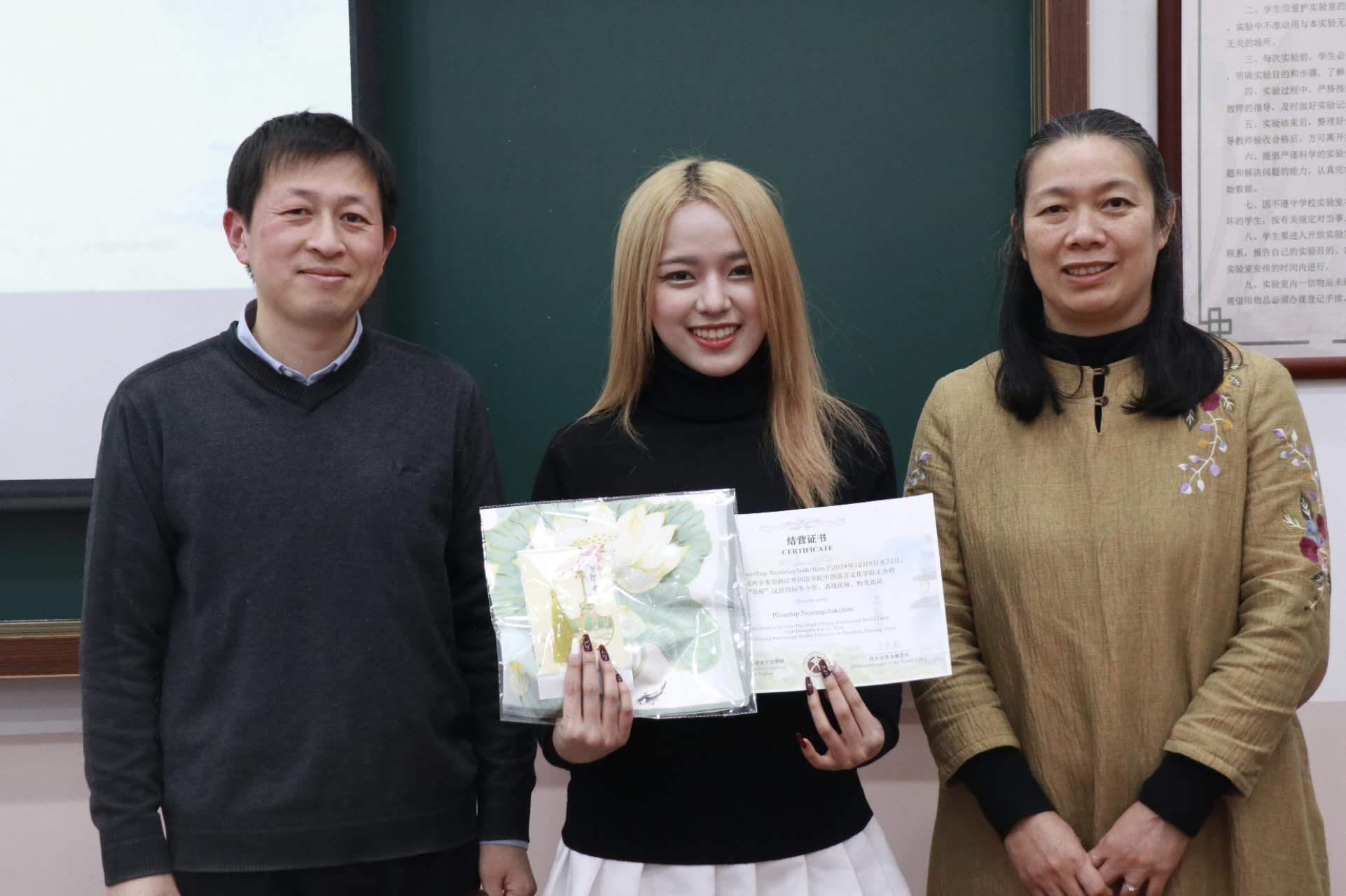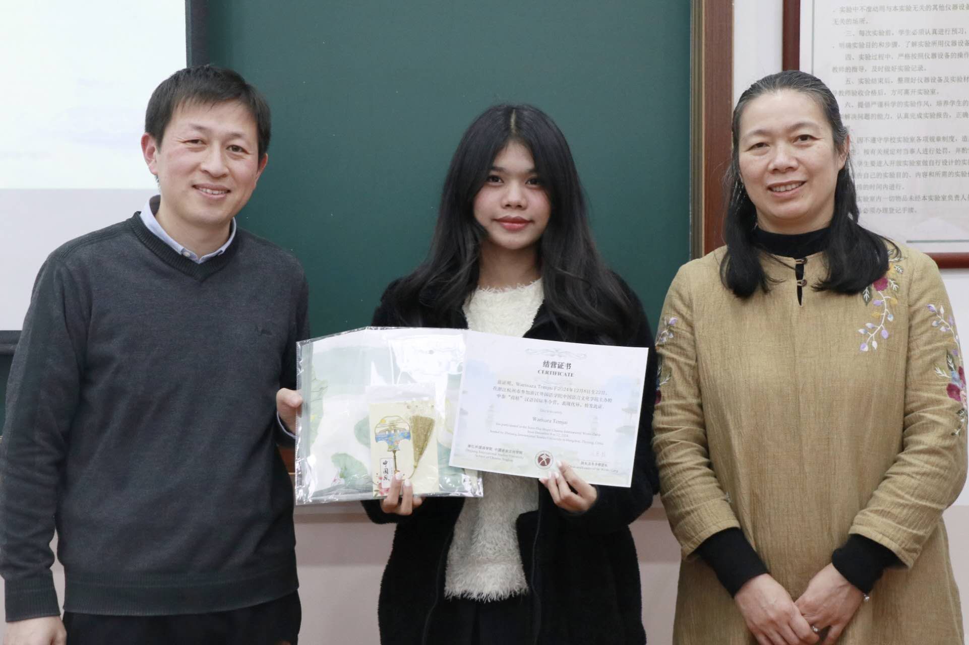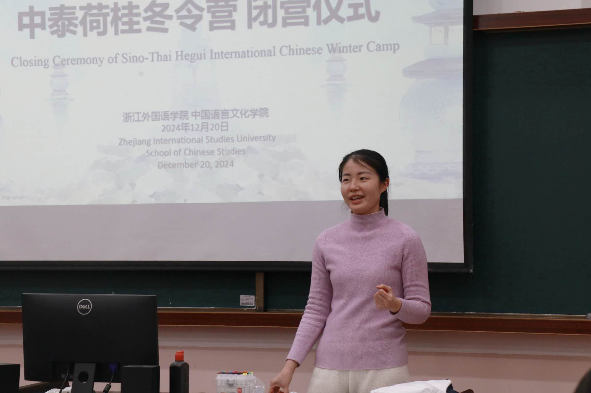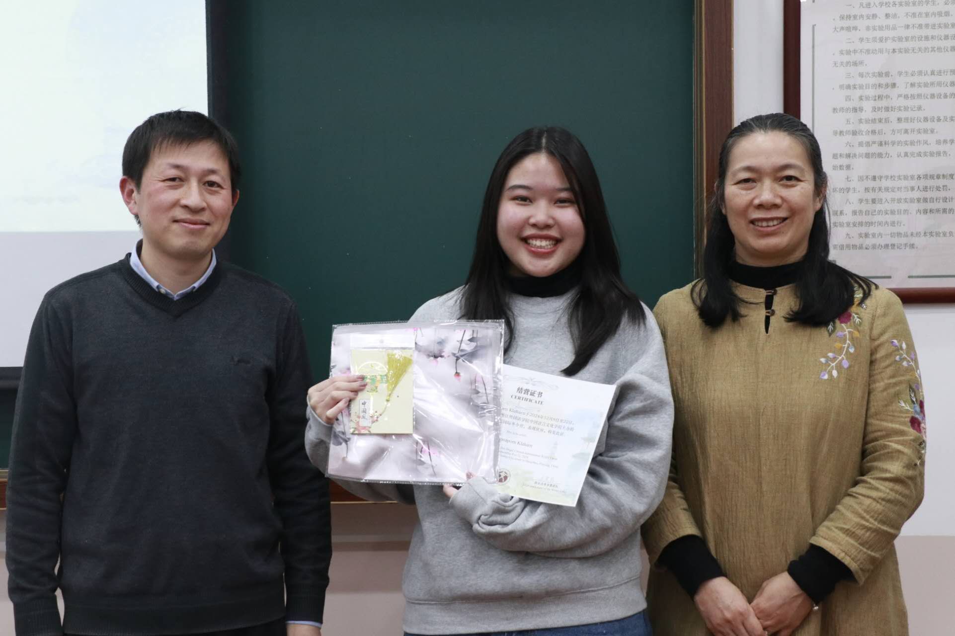 中文学院王翰霞老师回顾了此次冬令营活动的过程,分享了自己在冬令营中的感受。在活动期间,泰国同学们积极参与汉语学习及书法、茶道、剪纸、国画、太极等课程和学校的传统文化节,感受中华传统文化独特魅力。同学们参观了中国茶博物馆、浙江省博物馆、杭州博物馆,感受中国文化的历史底蕴,还参访了阿里巴巴与吉利极氪工厂,了解了中国现代企业发展,拓展了国际视野。