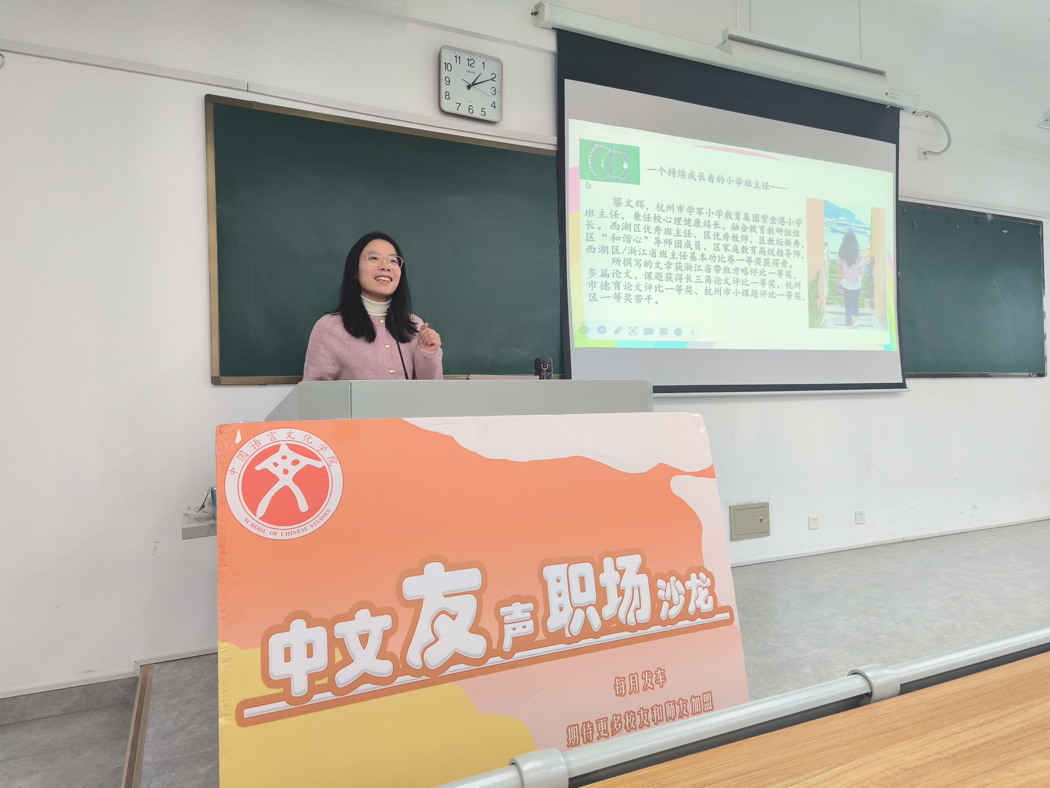 这一年中,中文学院持续开展友声职场沙龙,邀请了多位校友为在校生带来关于求职攻略、班主任工作、学生评价、新课标下语文课堂的变化等方面的讲座沙龙,既增强了各专业人才培养的实践性,又体现了校友与母校的情感延续性。