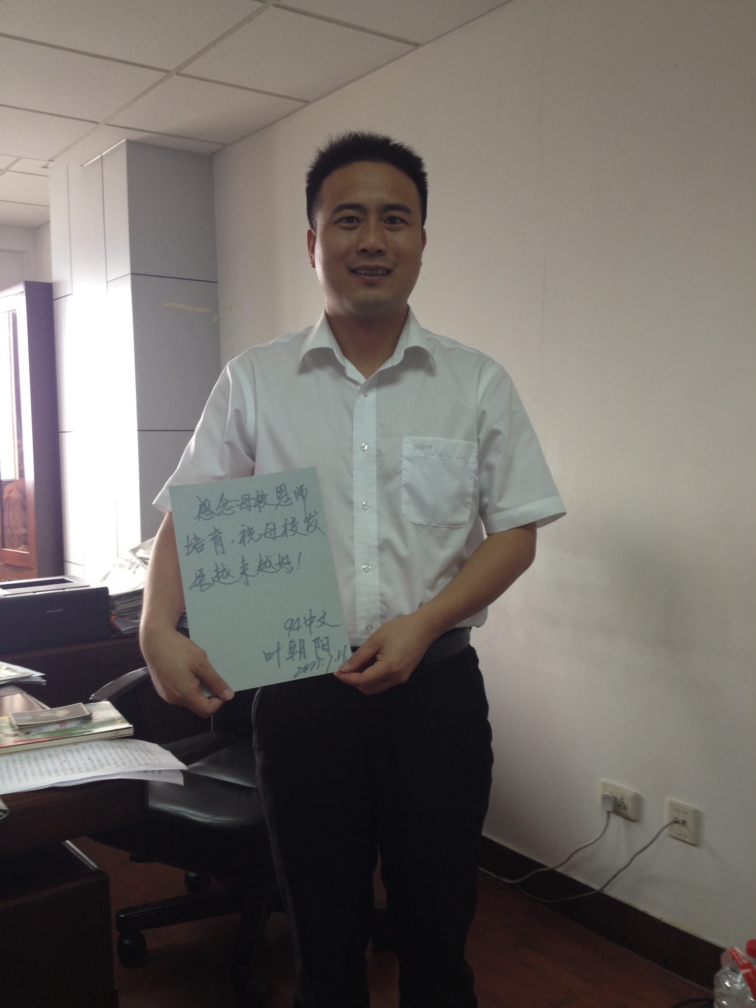 叶:我对母校的感情可谓是非常深,尤其是对老师的感情更深。你们现在很多老教师都教过我们,而且课都上得非常好,比如说齐刚老师和周明强老师。我还记得当年我在帮我们系主任搬家的时候看到他做的读书卡片, 10×15cm左右的大小,每张都是用钢笔把一些重要的用典、论文、字词释义等做了摘抄。大概因为是好几年积攒下来所以一共有几十捆,装了好几箱,我搬了大概快半个小时。当然,让我印象深刻非常尊敬的老师还有许多。我记得当时张孔义老师,他带着刚上小学的女儿来看望我们新生,平时对我们也如慈父般的关怀。那个时候我英语不好,没过四级,他还送了我英语补习的书籍。还有带着我们到德清高级中学去实习了一年的顾道弟老师,他的课声情并茂,我们毕业之后他还频频发表诗歌给大家分享。还有团委书记吕君芳老师,她教会了我们颇多做人做事方面的道理。还有做学生工作的老师,图书馆管理学生卡片的老师,虽然现在想不起他的名字了,但是他为了方便学生早上看书每天提前早起没有一句怨言,这种尽职尽责的行为我都一直记在心里。还有我们那个时候的宿管员,在毕业多年后还能记得我。虽然他(她)那个时候很凶,我们连没关门都要被他(她)训,但是现在回忆中还是美好,有人管是好事。(笑)