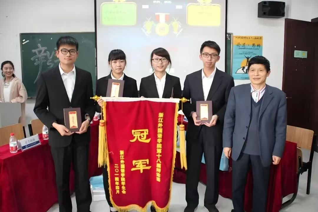 在校期间,作者(左一)参加学校第十八届辩论赛