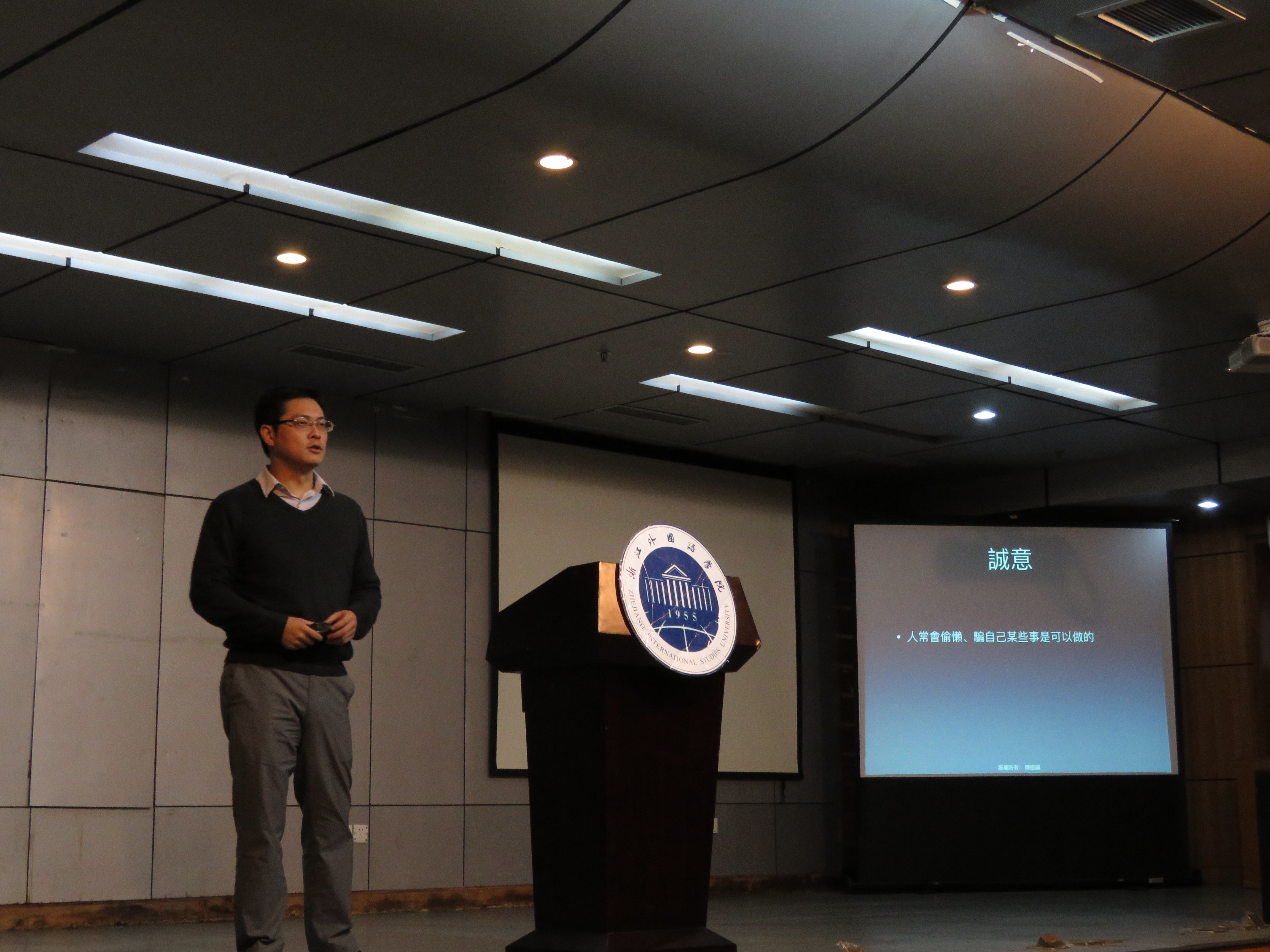 陈绍诚先生认为儒学如同一瓶醇香老酒,但是要将它装在新瓶子里。他的讲解角度独特,方式新颖,运用多学科专业知识将儒学思想与为人处世相结合,希望给全校师生带来新的启发,进而成己成物。