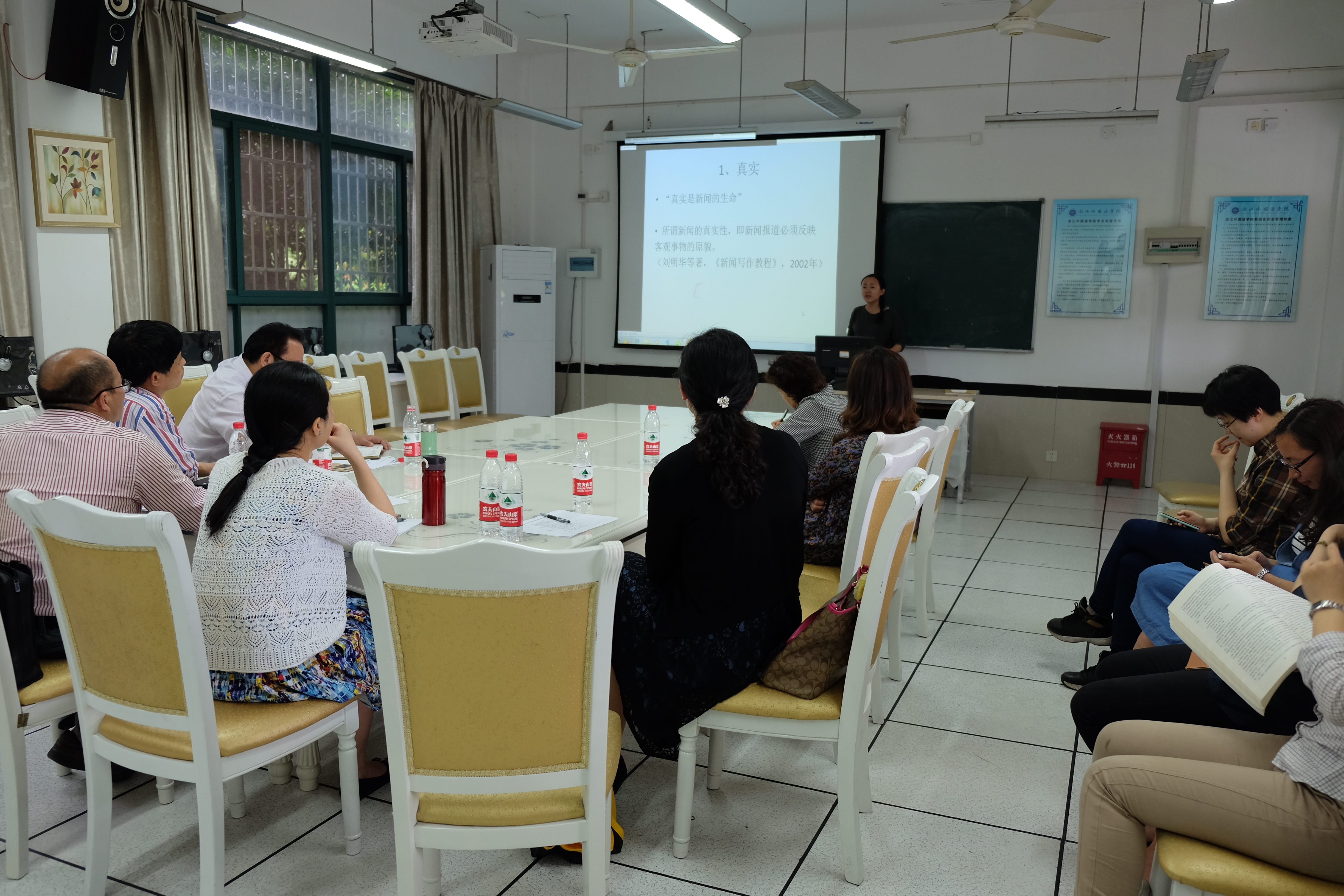 于实验楼会议室举办第四届教师教学技能竞赛。中文学院院长樊宝英、中文学院党总支书记吴莉萍、学校督导蔡廉和学院教师周明强、曾来海、陈海英、许菁频受邀担任评委。