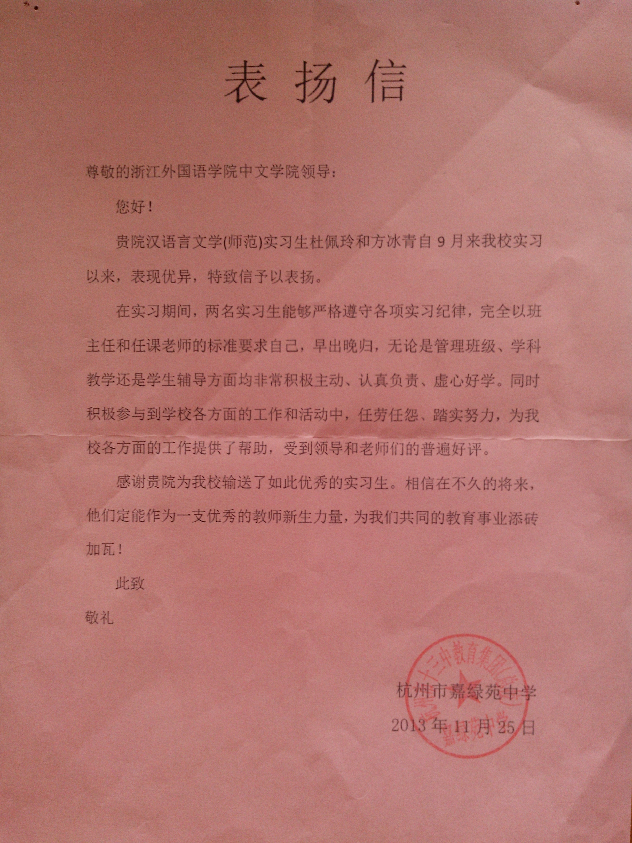 禁漫天堂 2014届师范生教育实习刚刚结束,就收到了来自杭州市嘉绿苑中学的一封表扬信。