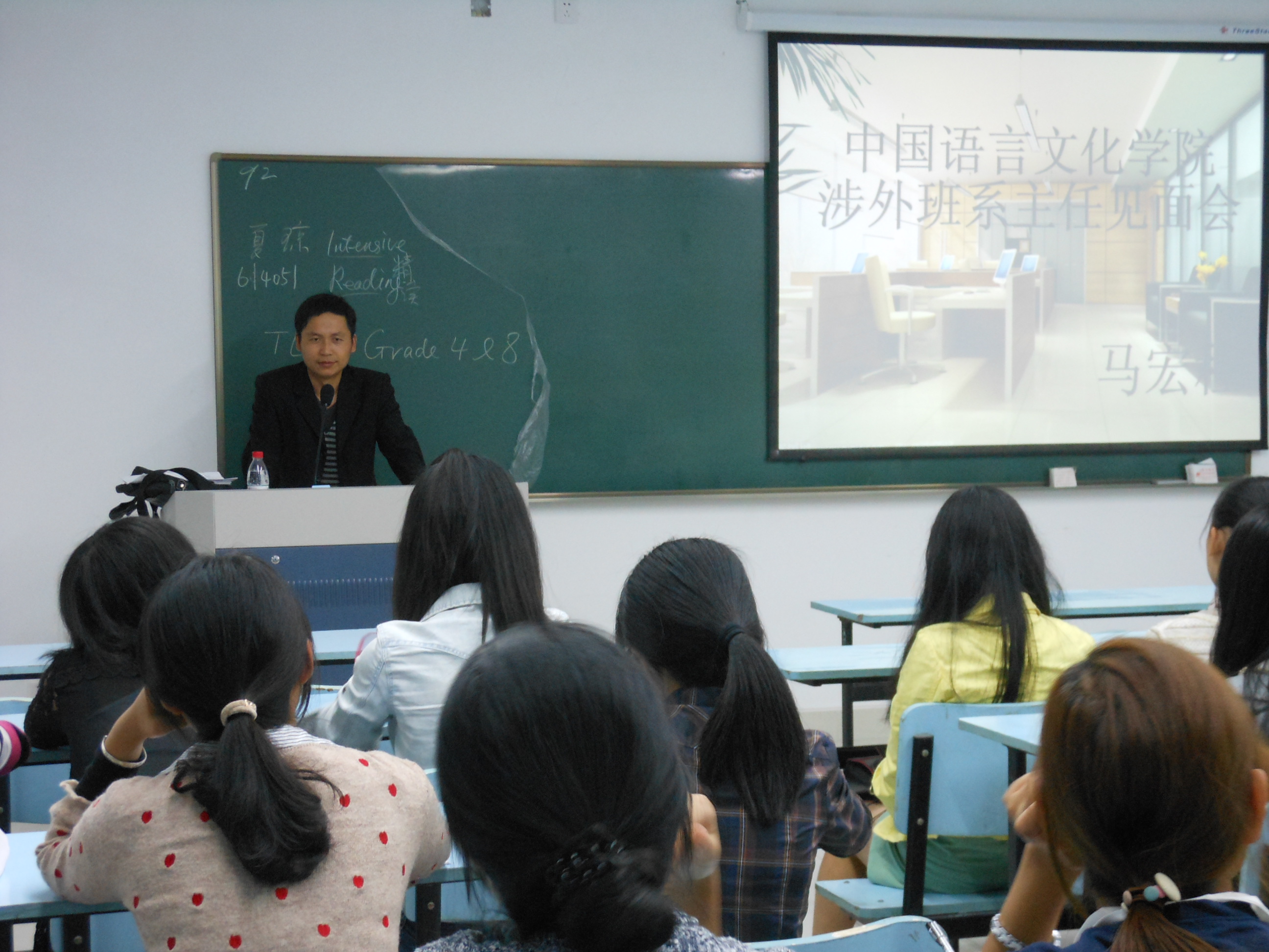 汉语言文学系系主任马丽老师不仅给新生详细解说了学院的学分要求,包括学习基础课、专业课和选修课的基本情况,还对汉语言文学师范类学生以后就业的方向、要求和形势做了分析,并强调学生要注意培养自己的综合学习能力。对外汉语系系主任李倩老师和国际文化传播系系主任马宏程老师分别针对对对汉语专业和涉外文秘、文化产业管理专业学生提出了自己的看法,阐述了各专业的相关设置和毕业后的专业就业定位。两位老师都强调了这几个“外”字当头的专业在学好汉语言文学知识的同时,必须要掌握强悍的外语专业技能和良好的交际能力。