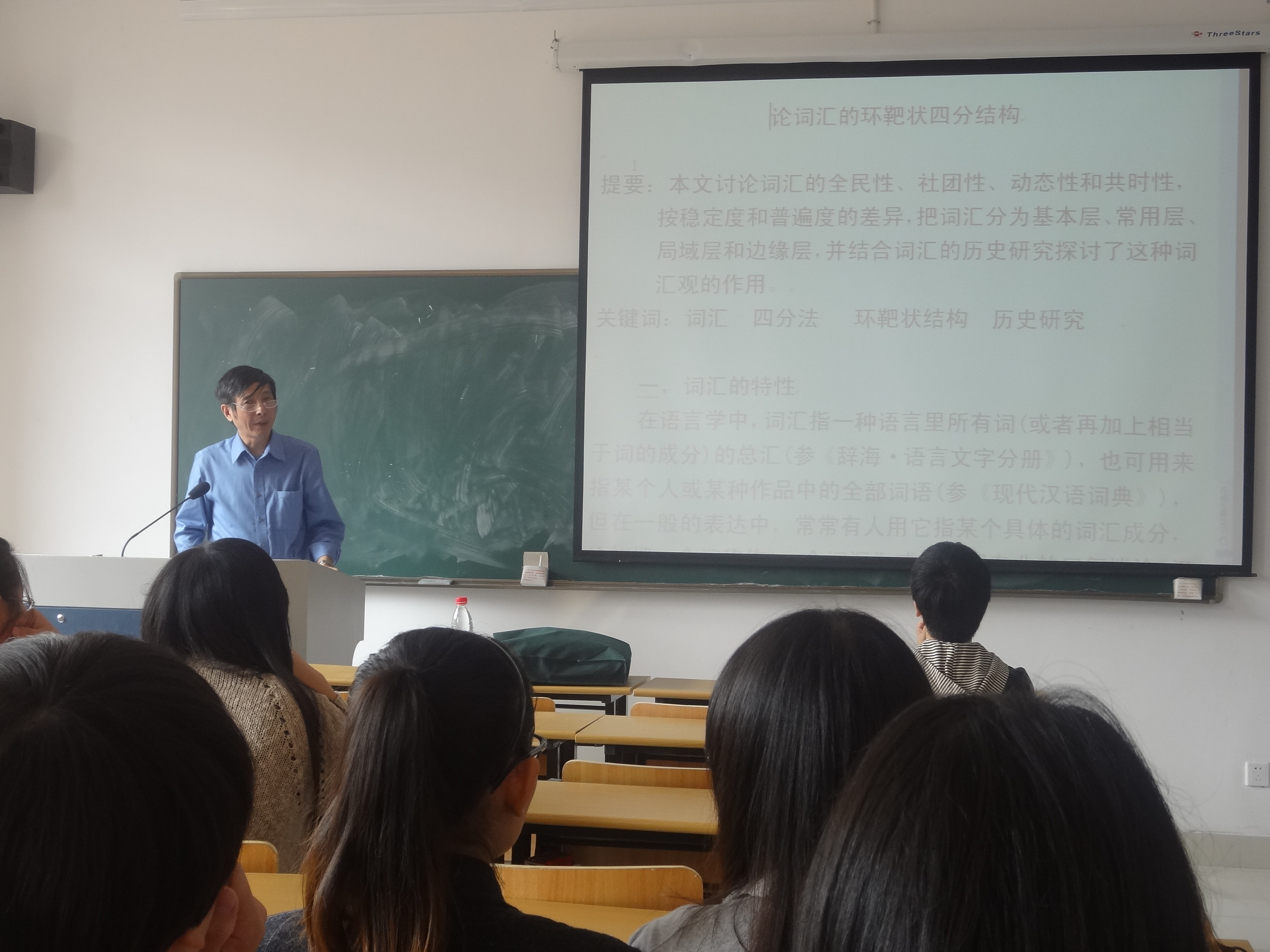 讲座伊始,俞理明教授从流行的网络用语引出汉语词汇的相关概念与分类,并紧紧围绕“词汇的环靶状结构”这个题目,从词汇的特性、词汇内部的宏观分析、历史词汇研究中几个常用概念的定位等方面进行了详细的阐述。他指出词汇具有全民性、社团性、动态性、共时性等4个特性。由于这些特性,研究词汇还应该关注其普遍性和稳定性对语言成分传承、民族传承的重要性。并指出了词的历史和词汇的历史之间存在的联系和区别:“词的历史侧重于个别词的变化,而词汇的历史则注重每个时期所有词之间的关系,以及随着时间的推移,这种关系所发生的变化。”