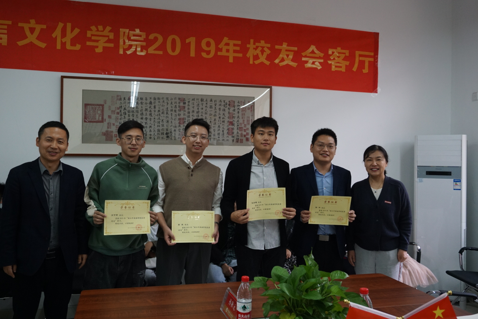 2019年校友会客厅活动在学院会议室品C305举办,党党总支书记黄莺、副院长马宏程、副书记陆卫斌等出席会议。活动正式开始之前,黄书记和马院长向汪华鹏等4名校友颁发校“优秀校友奖”证书并进行合影留念。
