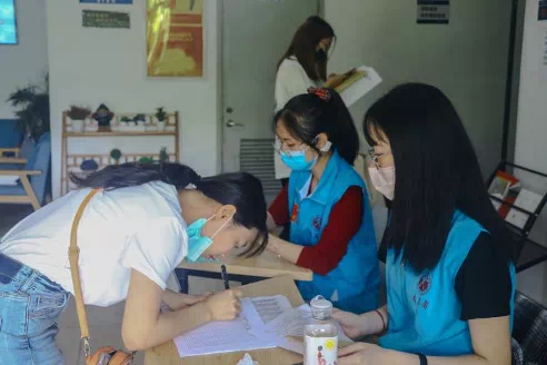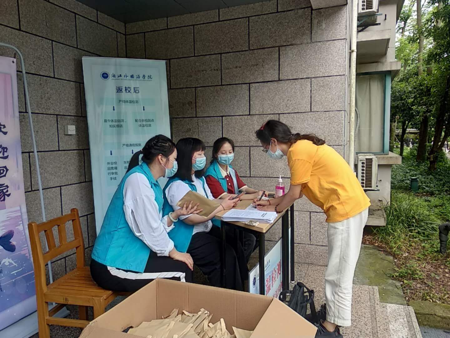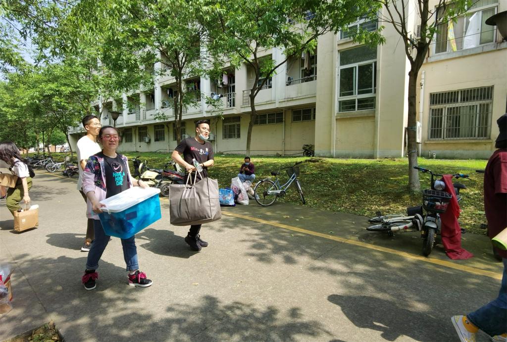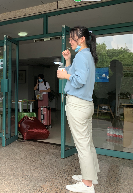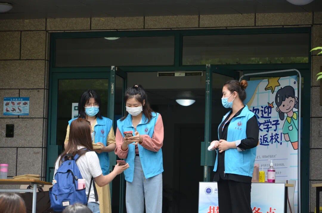 而在校内,有许多道身影也在从早到晚地忙碌着。早晨六点半,天色刚亮,由班主任、学生志愿者组成的检测点志愿小组便来到相应寝室楼下的报到服务点,静候同学到来,轮班值守,一直工作到晚上10:30,为返校同学完成扫码测温、发放防疫物资包、扫码等报到程序。