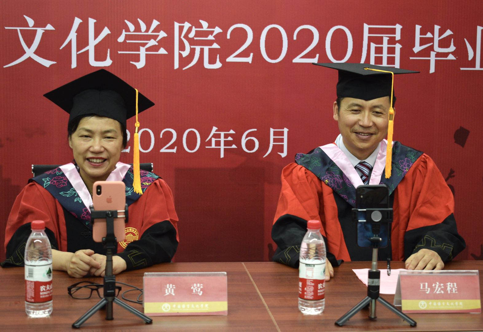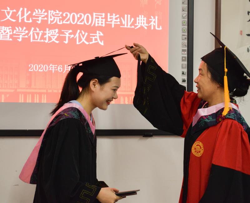 在学位授予仪式上,黄莺和马宏程为来自各班的4位毕业生代表一一拨穗,并颁发毕业证、学位证。