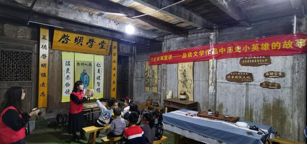 百福岩村的“启明学堂”,是村里的文化场所,也是平时许多祖辈带着小孩子们活动的“基地”。在这里,宣讲队员也给学龄前后的小朋友们也讲起了故事。