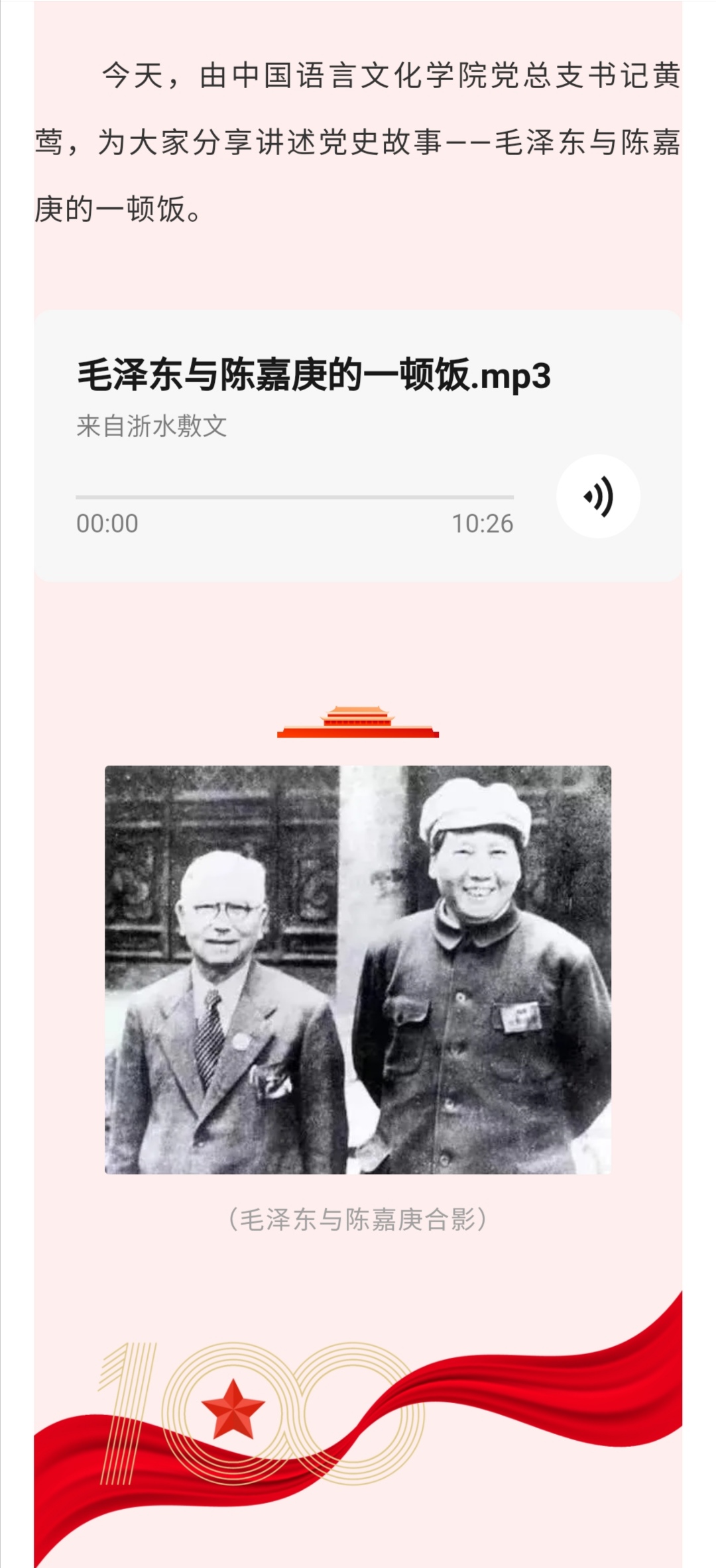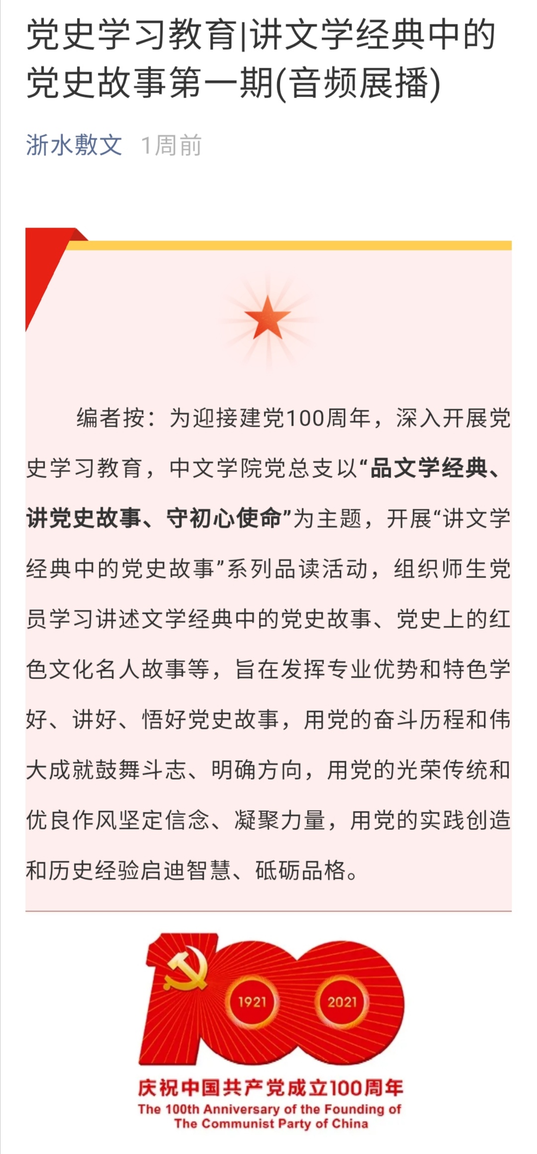 自4月始,学院党总支组织全体师生党员通过学习党史、新中国史、改革开放史、社会主义发展史等内容,精选文学经典中的党史故事、党史上的红色文化名人故事等,以讲故事的形式录制成音频,在学院“浙水敷文”微信公众号上逐期推送。