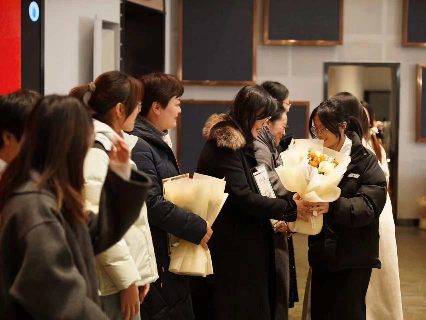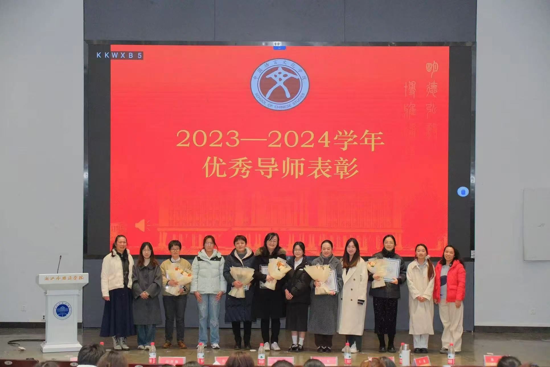 在优秀导师颁奖表彰环节,马丽、李妍、许菁频、陈海英、邵静、金旸、赵东旭等七位导师获得“2023-2024年度优秀导师”荣誉称号,杨飞群为优秀导师颁发荣誉证书,学生代表为导师献上鲜花。
