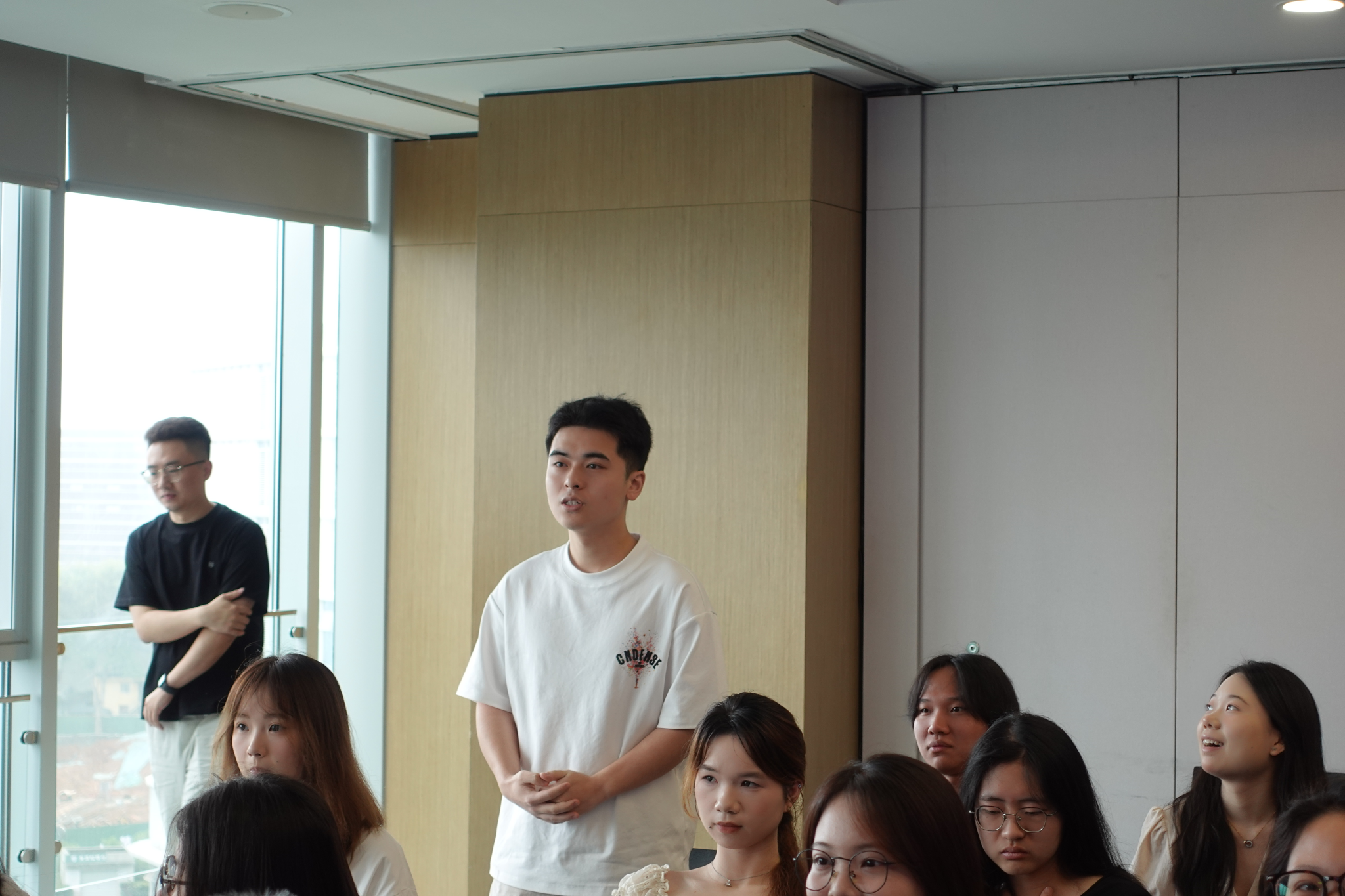 互动环节,同学们围绕专业实践路径、实习岗位设置、职业发展规划等热点问题踊跃提问,企业方与校友代表逐一细致解答。22汉教班吴安娜表示“以前只知道珀莱雅是知名国产护肤品牌,在这次走访中才真正读懂品牌内核,感受到了这里充满活力、融洽的工作氛围, 让人心生向往。”24网新2班的高嘉诚在沉浸式参观后感慨:扎实的专业知识、敏锐的市场洞察力以及持续的创新思维,是未来在相关领域发展不可或缺的要素。