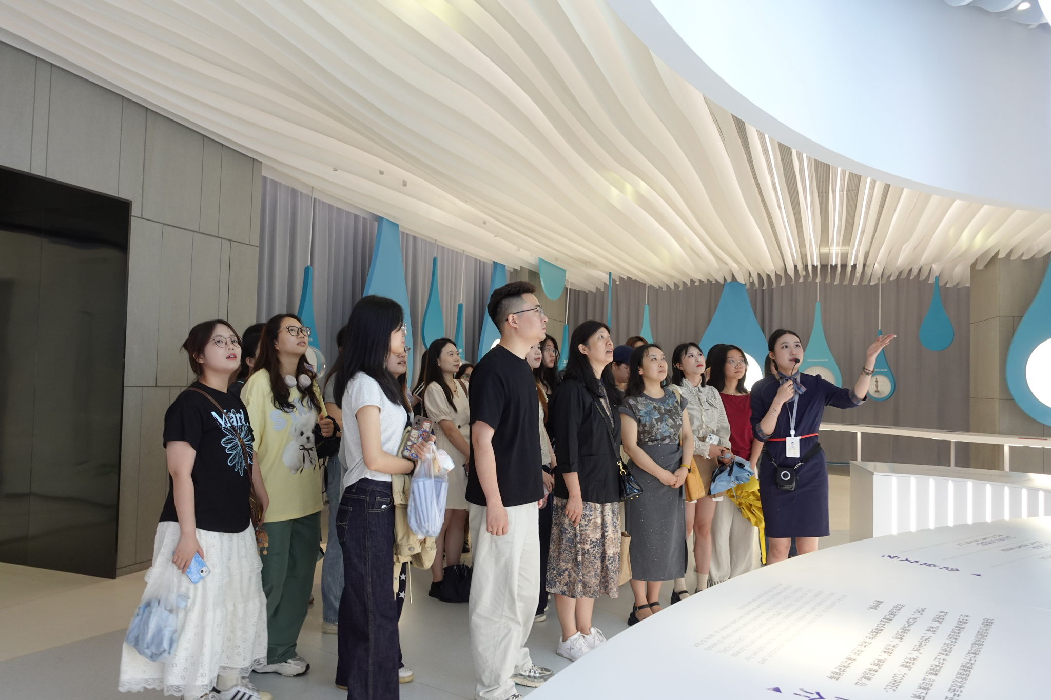 在珀莱雅相关负责人的陪同下,师生们首先参观了珀莱雅成长展厅,溯源企业发展脉络。通过丰富的图文资料与实物陈列,师生们系统了解了企业自创立以来的发展历程、核心经营理念及品牌战略布局。在产品展厅内,师生们近距离接触了珀莱雅旗下多元品牌矩阵及创新产品,对美妆行业的市场动态与产品研发有了直观认知。企业方也通过短片与详细讲解,向在场师生展示了公司人性化化的工作环境与人才培养体系。