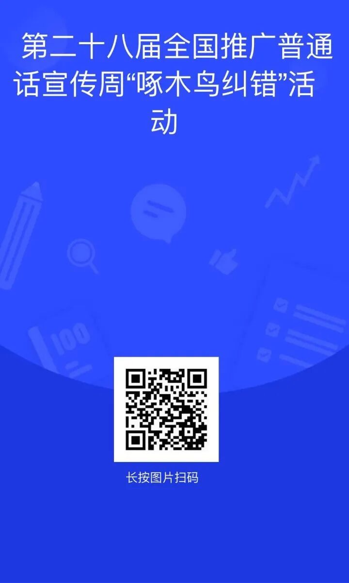 2.开展“啄木鸟纠错”活动。诚邀全校师生查找校园标识、宣传栏等环境中的错字别字及语言表达错误,若发现问题请于9月19日前扫描二维码提交,正确纠错的参与者可获推普周活动纪念品。