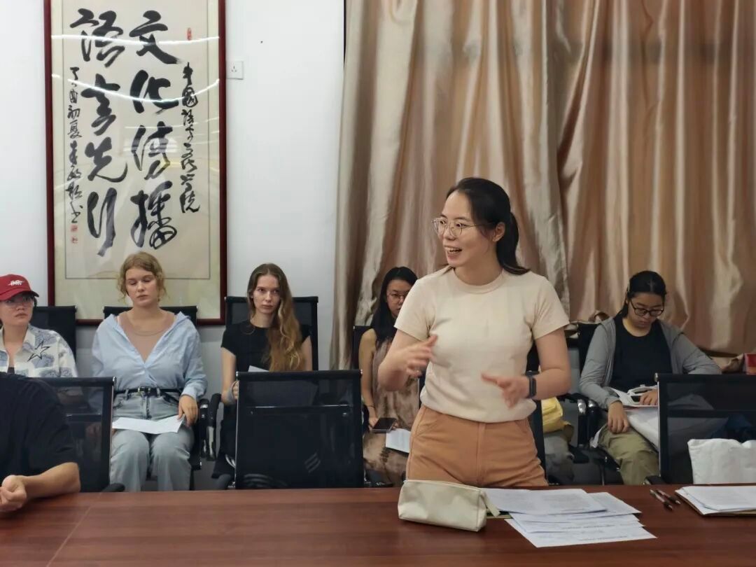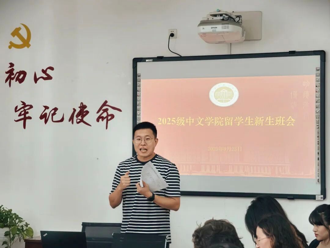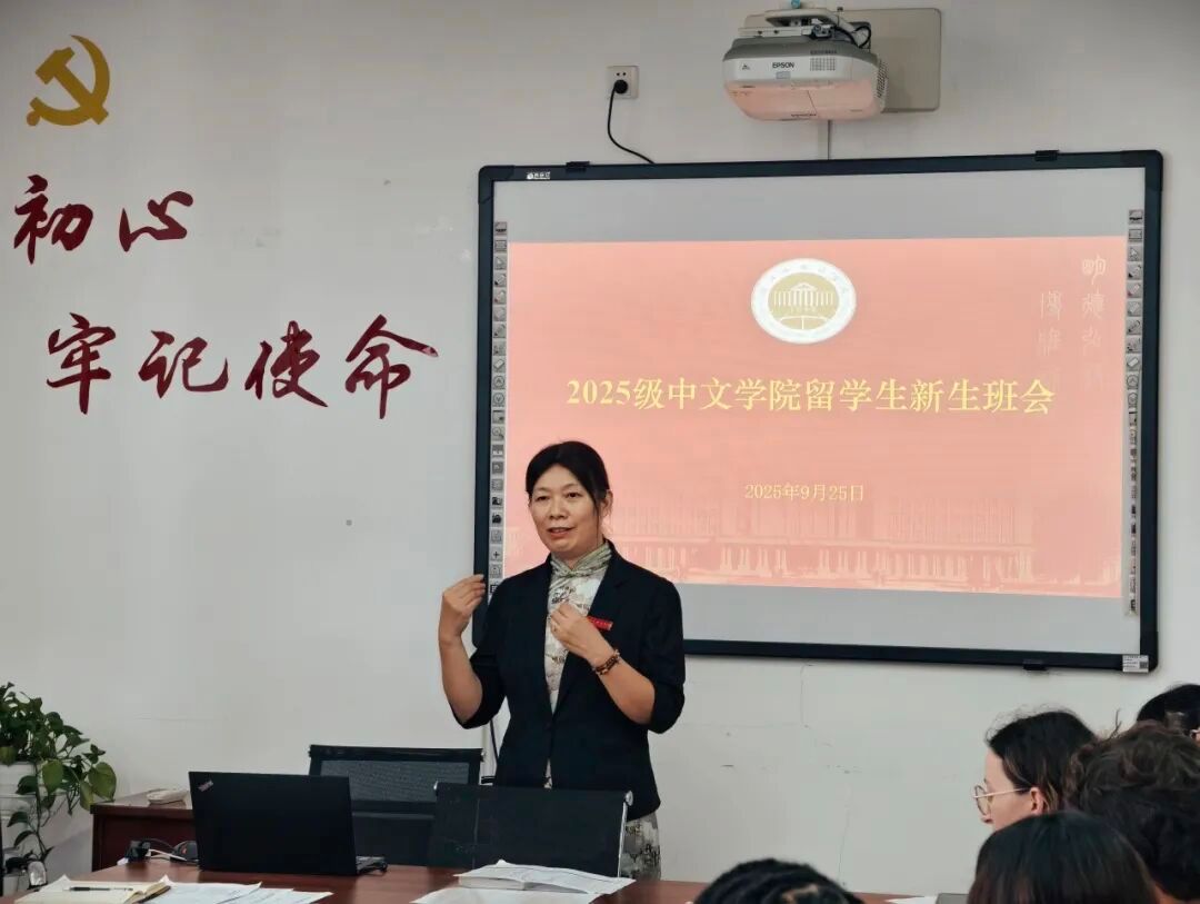 冯铮对专业课程作了简要介绍,强调了要保证出勤率,与任课老师做好沟通。25级留学生班主任何茹围绕校园安全和文化生活等事宜进行了详细说明,为同学们厘清了日常学习和生活的重点。教学秘书王翰霞针对考勤制度、成绩考核制度等进行了补充说明,并代表中文学院为留学生送上了精心准备的开学礼物,传递了学院的暖心关怀。