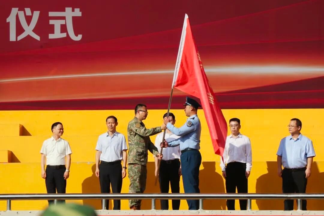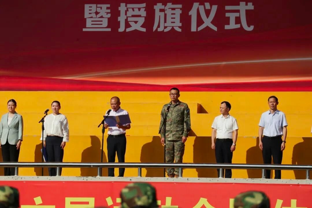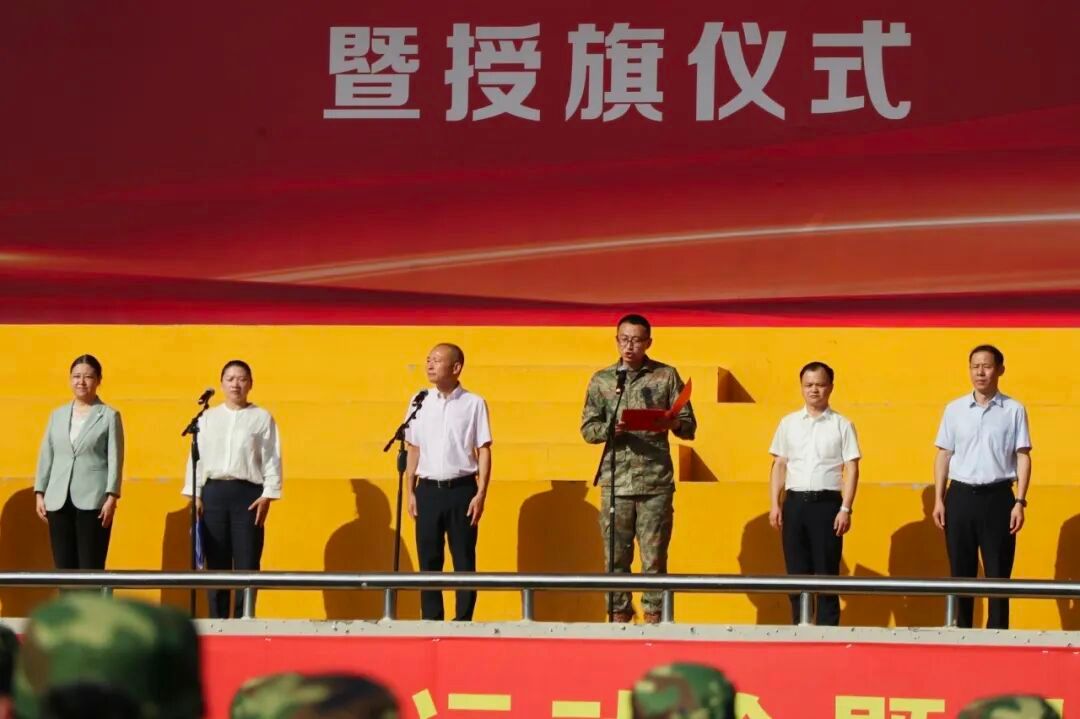张梁代表学校向军训团授团旗,王云飞向军训营授营旗。