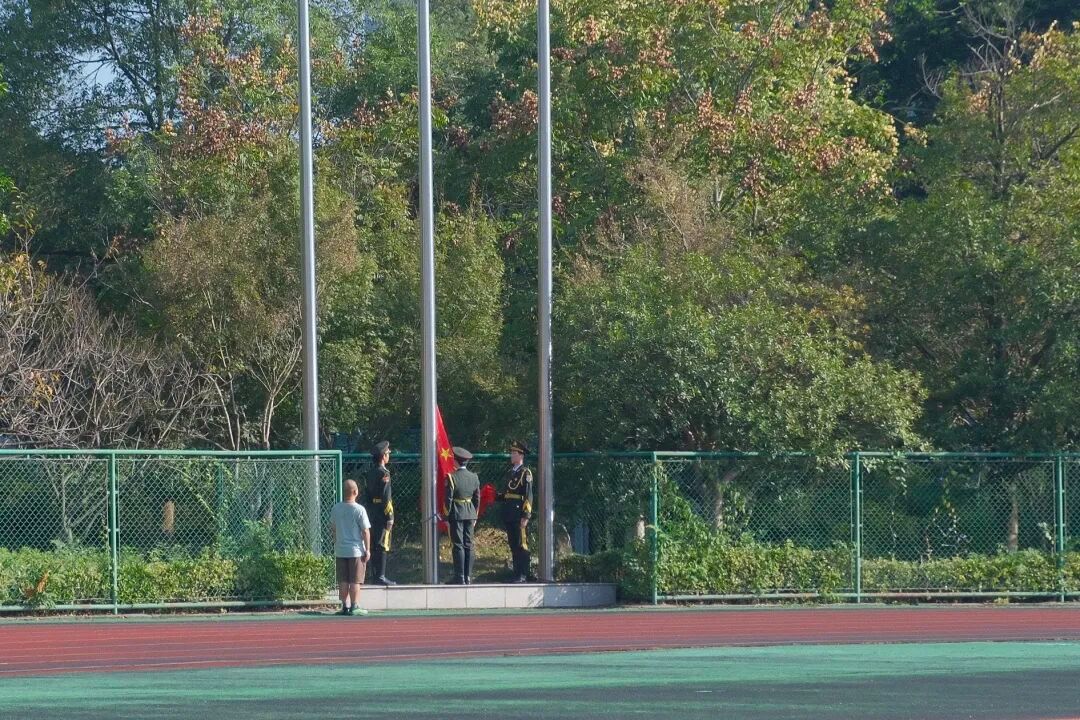 庄严的国歌声响起,全体人员一齐行注目礼,齐唱国歌。随着鲜红的国旗升起,青春的热血开始沸腾。