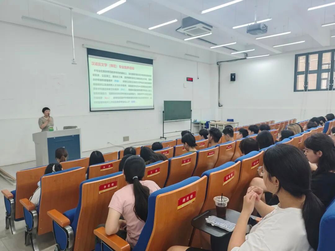 会上,专业负责人许菁频老师首先为新生们介绍了汉师专业的培养目标与课程体系。学院党委副书记周礼老师随后从师范生成长路径出发,阐述了大学生涯规划重点。辅导员任欣妮则结合最新的就业数据,为同学们分析了主要就业方向与发展前景,帮助新生提前树立职业目标。汉师系系主任孟夏老师也出席了本次讲座。