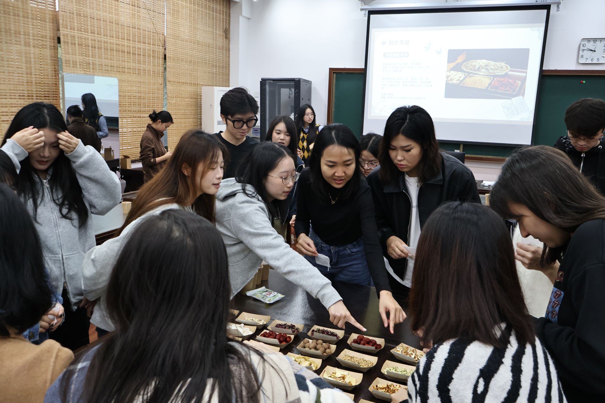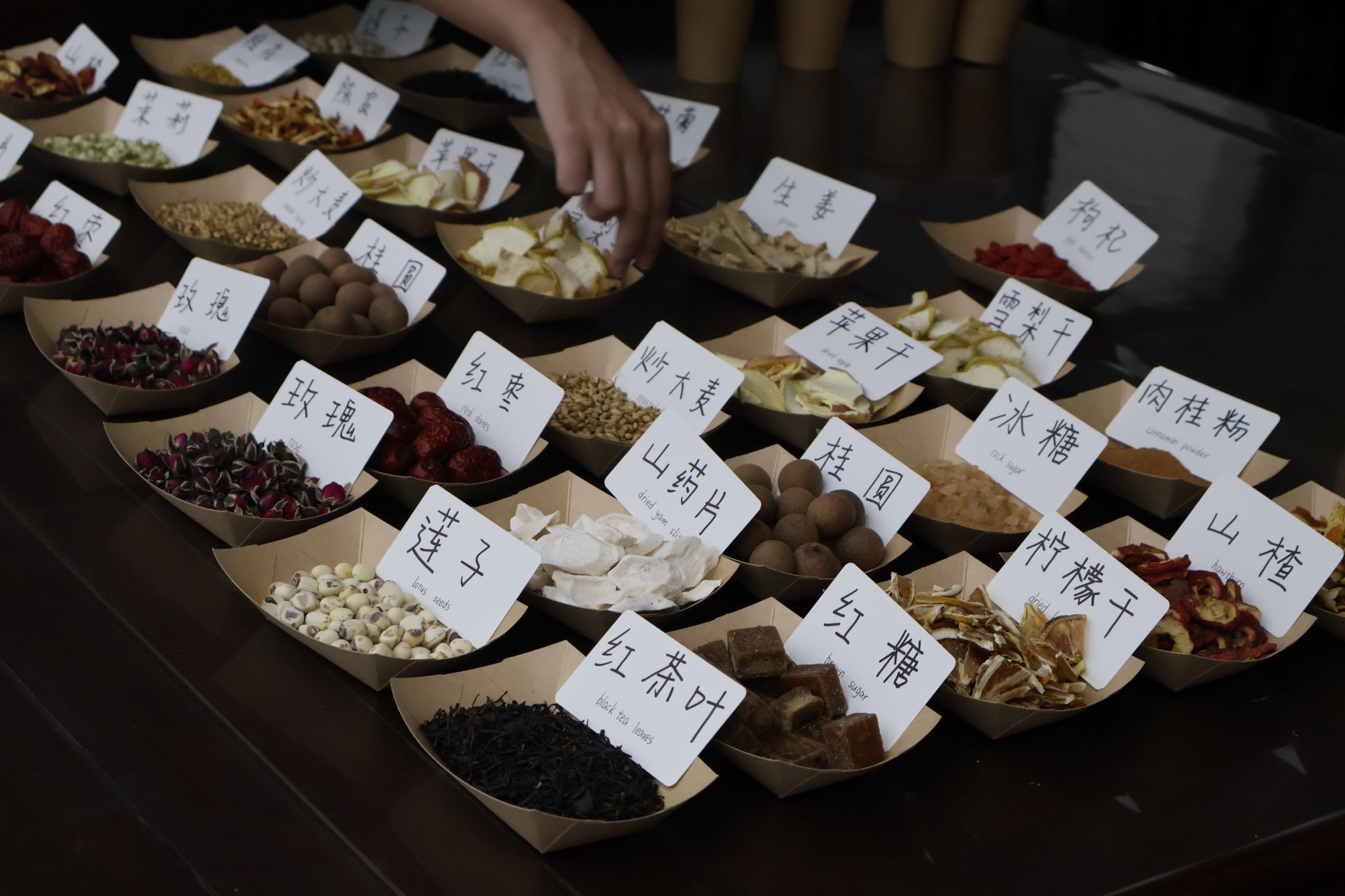 长桌上,二十余种食材整齐陈列,像一场微型“本草盛宴”。饱满的红枣泛着琥珀色光泽,切片的生姜带着清新辛香,嫣红的枸杞、醇厚的陈皮……张琴与张一硕同学逐一介绍每种材料的搭配方法:“红枣补中益气,桂圆养血安神,搭配生姜可驱寒暖身,特别适合立冬后饮用。”留学生们听得认真,对桌上的材料充满了兴趣,现场互动热烈,跨文化的好奇心在食材香气中悄然蔓延。
