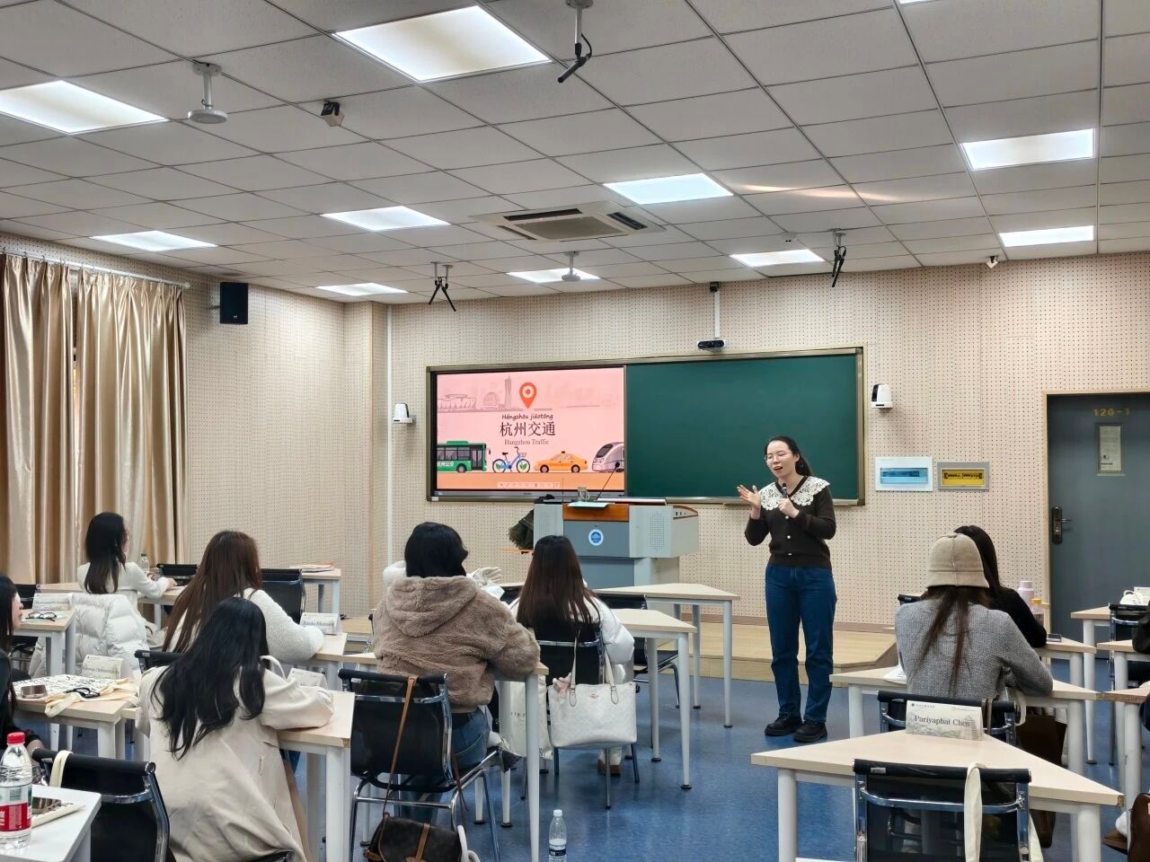 在语言学习环节,何茹老师为泰国学员们带来了数堂生动实用的汉语课程。她以富有感染力的教学方式,将日常对话、文化词汇融入课堂,如怎么打车、认识杭州地铁网等,不仅提升了学员们的语言能力,更激发了他们进一步探索汉语世界的兴趣。在文化体验环节,任欣妮老师开设了茶道课。她先简释茶文化脉络,演示盖碗茶“温器、投茶、冲饮”步骤,随后指导泰国学子亲手操作。助教张一硕、张琴还带学员们一起制作了茶包,当学员们品尝到自己亲自泡的茶汤,清醇回甘间满是惊喜,直观感受中国茶文化的雅致。