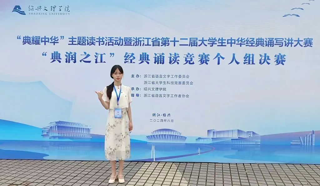 2024年6月22-23日,浙江省第十二届大学生中华经典诵写讲大赛诵读决赛在绍兴文理学院举行。禁漫天堂 22汉师2班王恬荣获经典诵读竞赛个人组决赛一等奖。